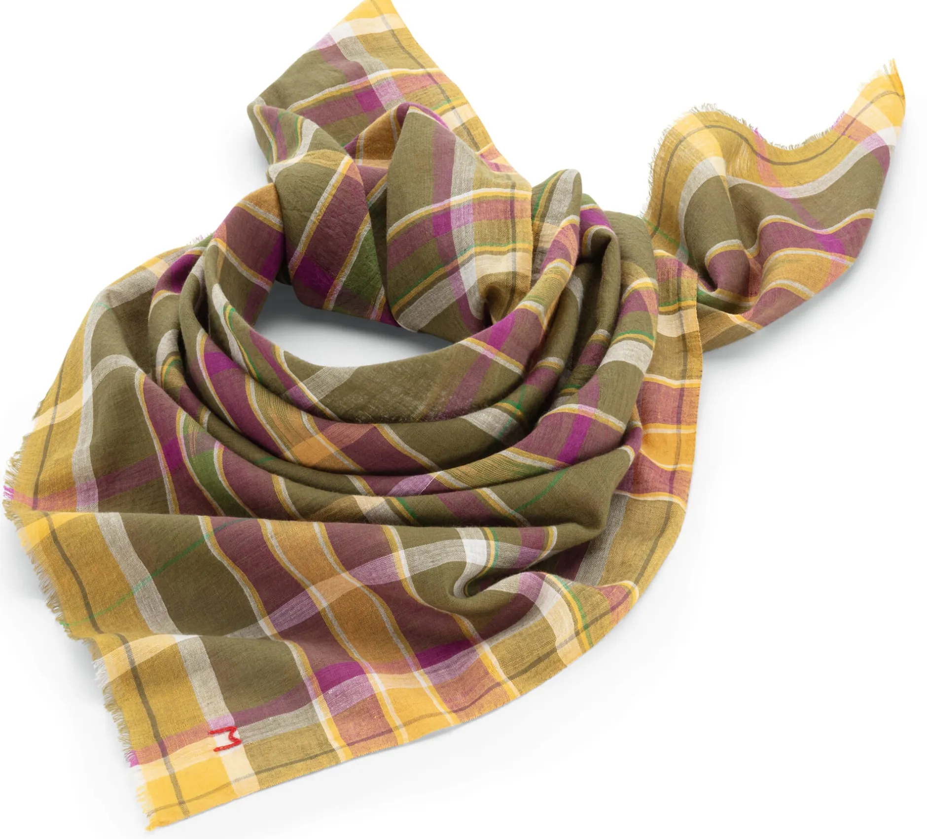 Das leichte Baumwollgewebe dieses Tuchs zeigt ein eingewebtes farbenfrohes Karomuster. Zwei Seiten des quadratischen Tuchs schließen mit Webkanten ab, die anderen beiden mit kurzen Fransenkanten. An einer Stelle ist ein farblich passendes M-Logo eingestickt.