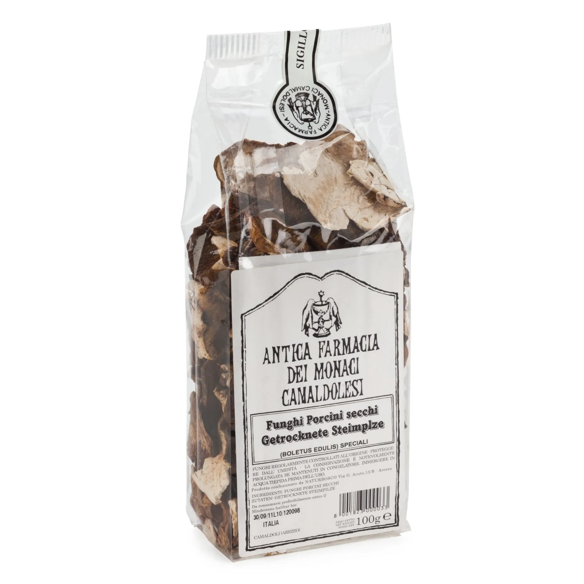 Italien kennt keine einheitlichen Namen für seine Pilzsorten, es gibt daher mindestens vier als „fungo porcini“ bezeichnete Sorten, darunter auch der weniger aromatische Birkenpilz. Von den Camaldulensermönchen in der Toskana kommt jedoch der echte Steinpilz (Boletus edulis), der für seinen Geschmack berühmt ist: in ausgesuchter Qualität, getrocknet und zum Verfeinern von Suppen und Saucen.