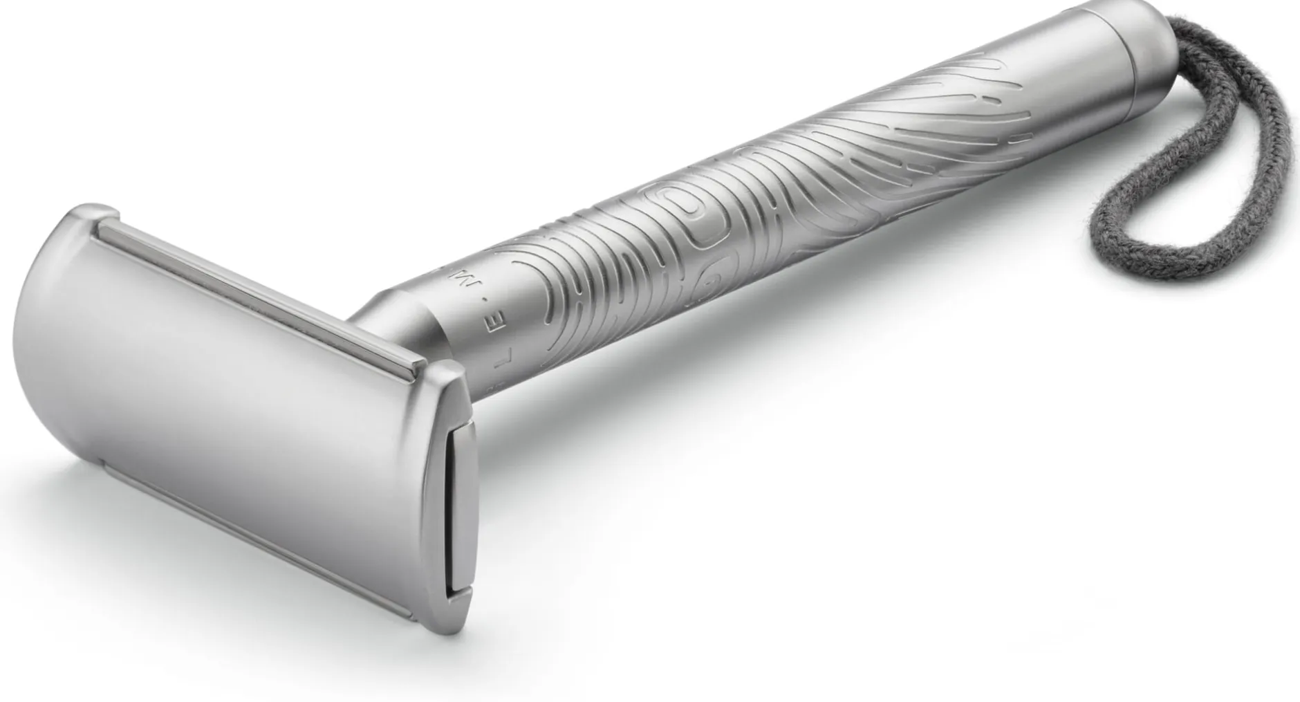 Dreiteiliger Rasierhobel. Griff aus Edelstahl, Hobelkopf aus Zinkdruckguss, beides matt verchromt. Austauschbare Aufhängeschlaufe aus Baumwollkordel. Lieferung mit einer Rasierklinge.