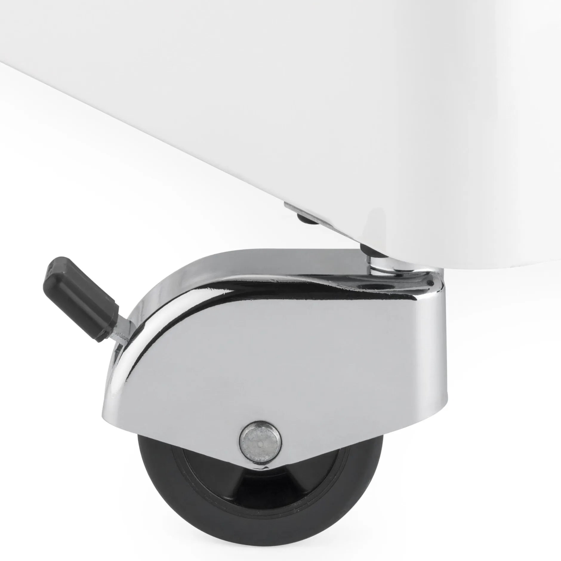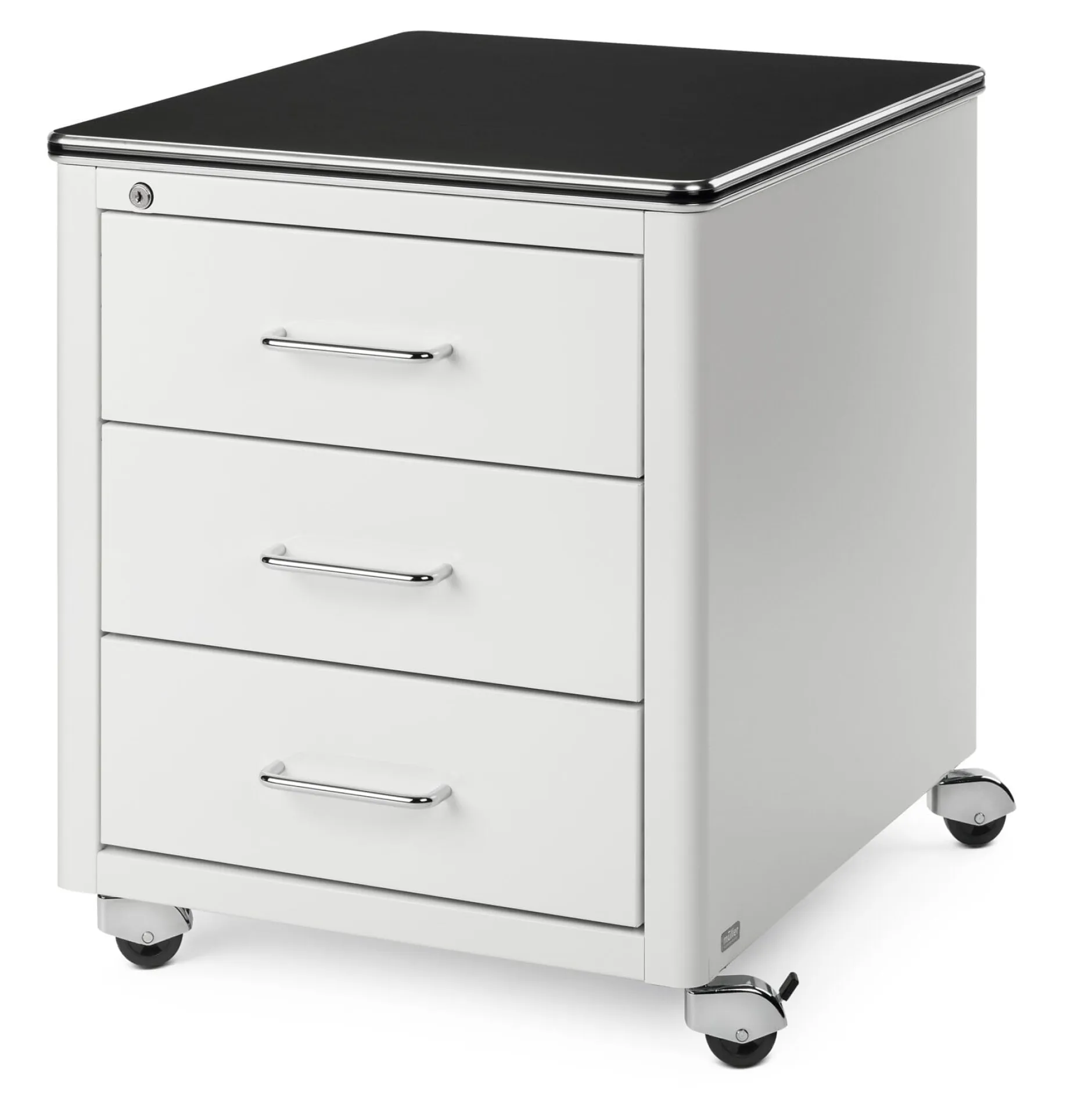 Rollcontainer aus 1 mm starkem, in frei wählbarer RAL-Farbe lackiertem Stahlblech, mit Zentralverriegelung. Vier Lenkrollen, die beiden vorderen feststellbar. Deckplatte Tischlerplatte mit Linoleumbelag. Farbe Weiß, mit schwarzer Deckplatte. Mit drei Schubladen. Hergestellt in Deutschland.