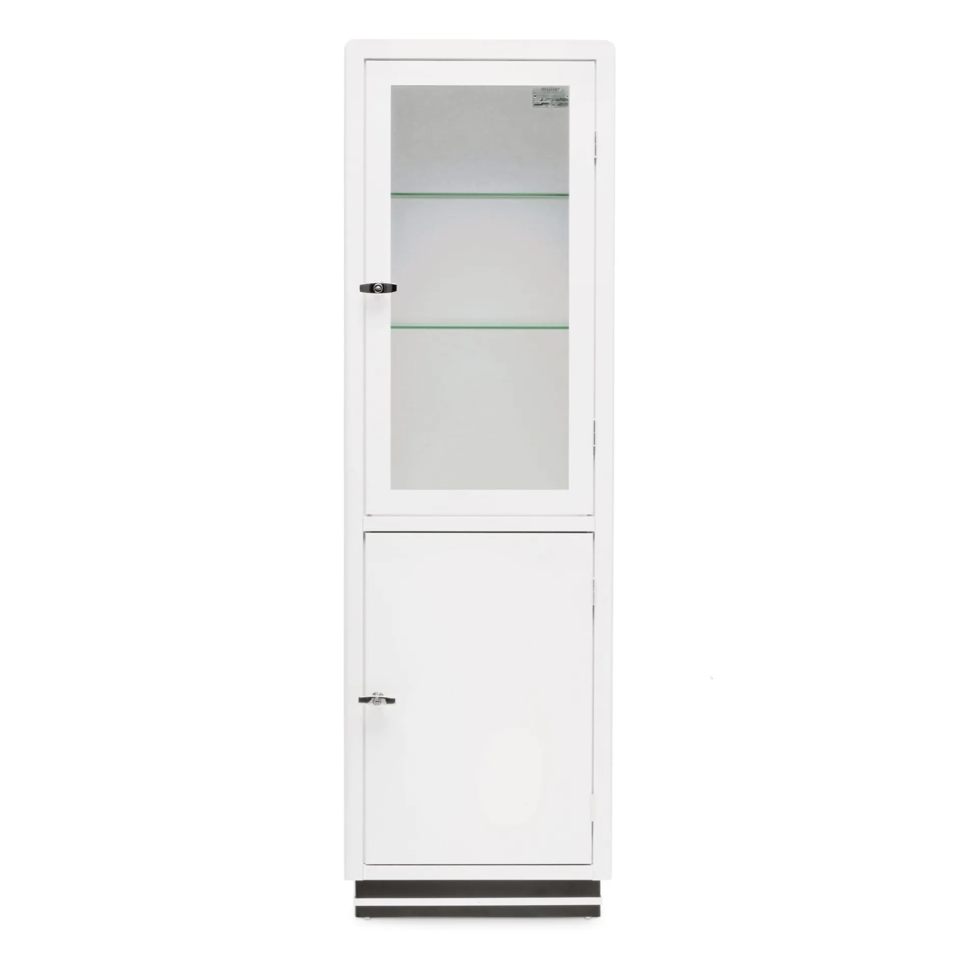 Wir bieten Ihnen die Stahlblechvitrinen mit erweiterter Ausstattung an: Sie verfügen über einen zusätzlichen, dritten Glasboden und sind, anders als Müllers Standardmodelle, grundsätzlich mit abschließbaren Griffoliven versehen. Weitere Ausstattungsvarianten: z.B. durchgehende Glas- oder Metalltüren, satiniertes Glas, Innenbeleuchtung und zusätzliche Einlegeböden.