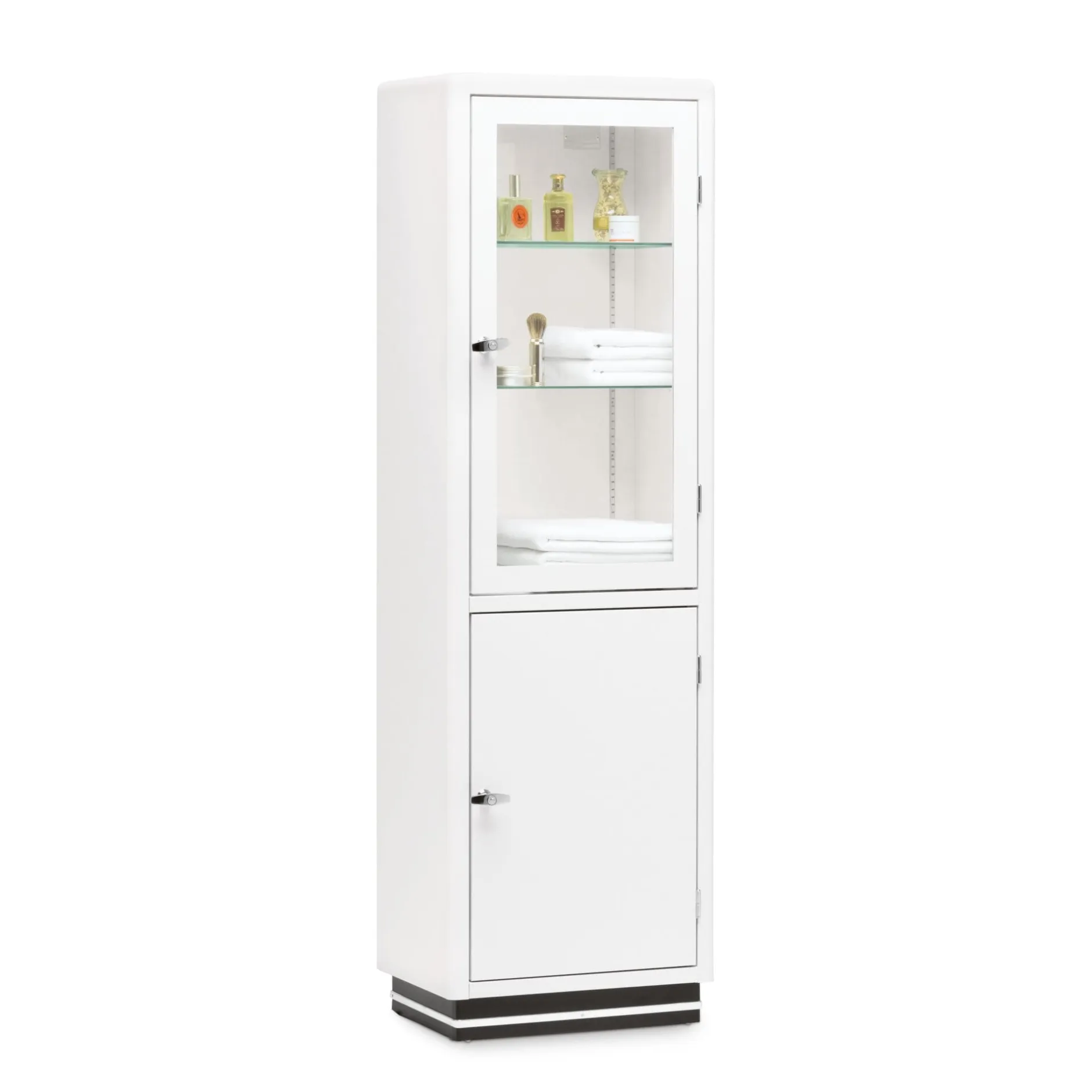 Vitrine aus lackiertem Stahlblech mit einer Glas- und einer Metalltür, Türanschlag rechts. Drei höhenverstellbare Glasböden, ein fester Zwischenboden aus Stahl. Verchromte Griffoliven, abschließbar.