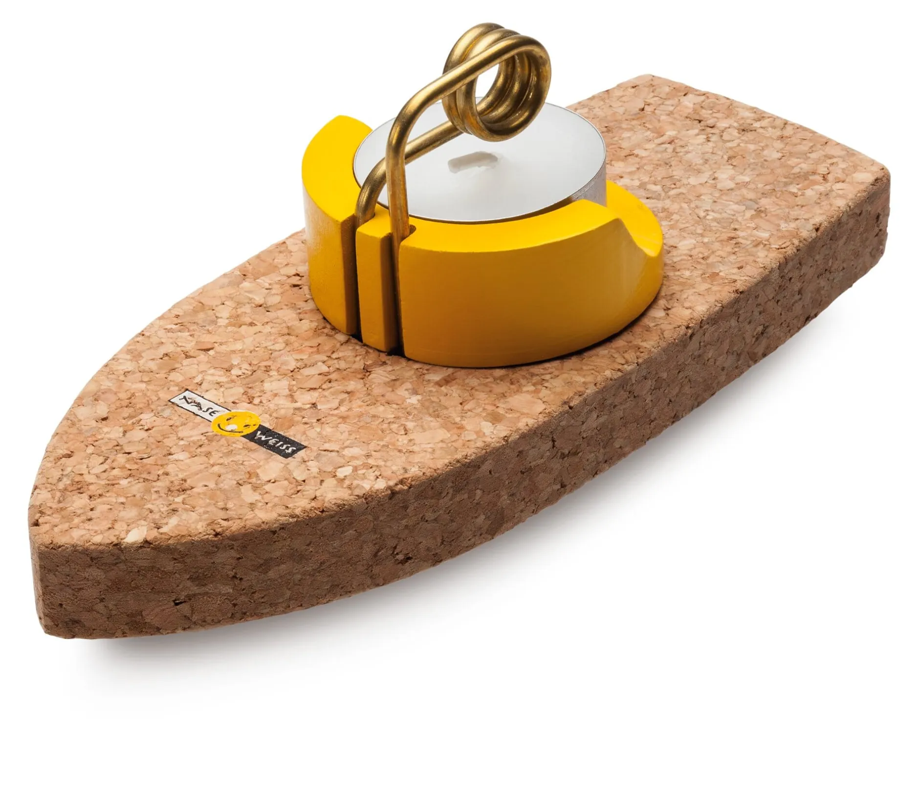 Der Schiffsrumpf ist aus Kork, dadurch schwimmt es besser als die früheren Modelle aus Holz und fährt sogar ein ganz kleines bisschen schneller. Der Pulsarmotor ist drehbar, sodass sich die Fahrtrichtung beeinflussen lässt. Gefertigt wird es in Baden-Württemberg.