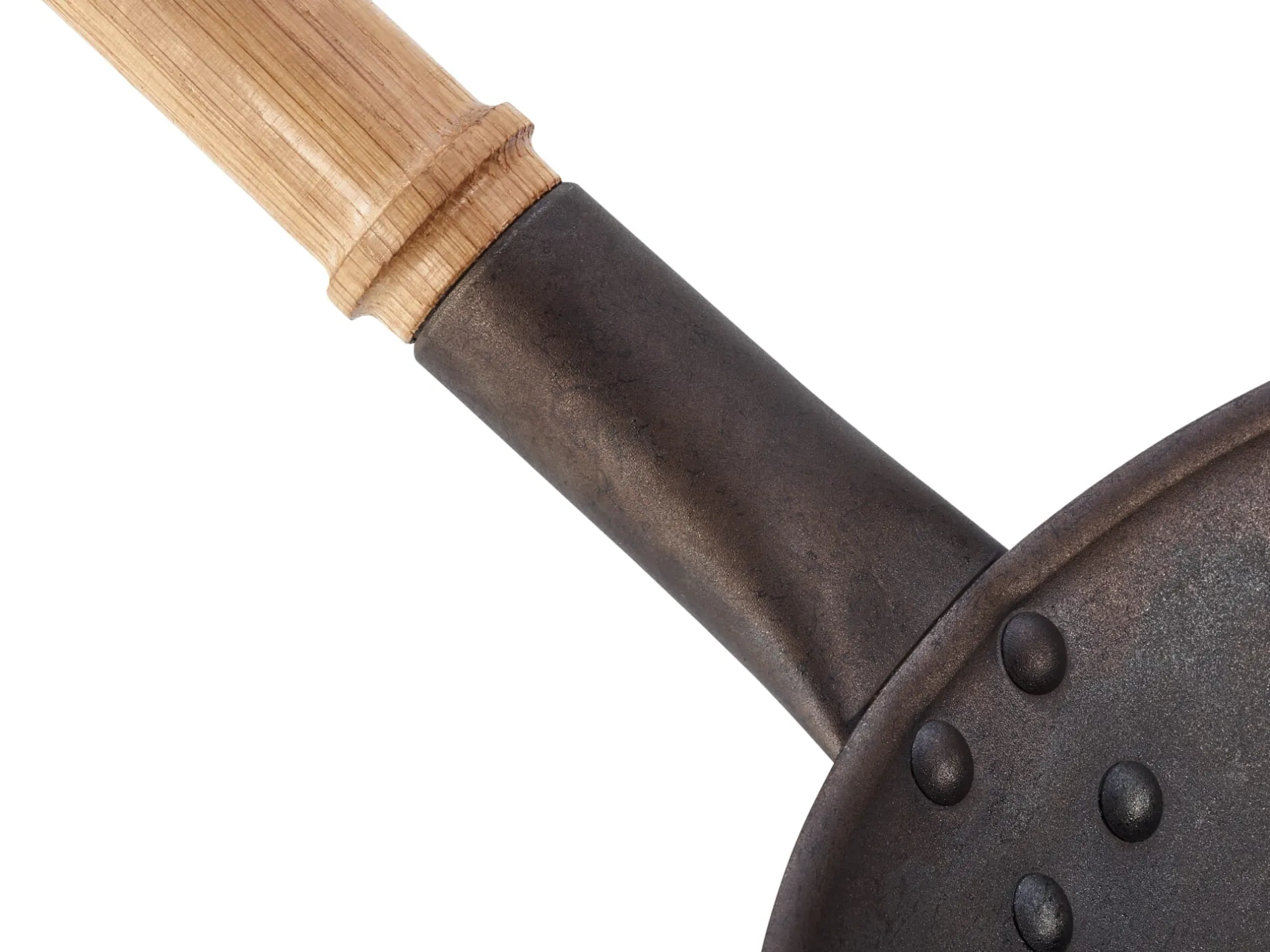 Wie hier zu einem Millimeter Wandstärke tiefgezogen, erwärmt sich das brünierte Eisen innerhalb kürzester Zeit und gibt die Hitze des Herdes ohne Umwege an das Gargut weiter. So eignet sich dieser Wok vorrangig zum Sautieren oder Braten von Fleisch und Gemüse, kann aber wie in der asiatischen Küche üblich ebenso zum Dünsten, Blanchieren, Schmoren, Frittieren, Rösten und Dämpfen von Speisen verwendet werden. Im Vergleich mit anderen gusseisernen Modellen ist der Wok aus der Netherton Foundry sehr leicht und lässt sich daher gut mit einer Hand schwenken. Die Gießerei in Shropshire verkauft dieses Modell mit Holzgriff nach eigener Aussage häufig an japanische Restaurants in England.