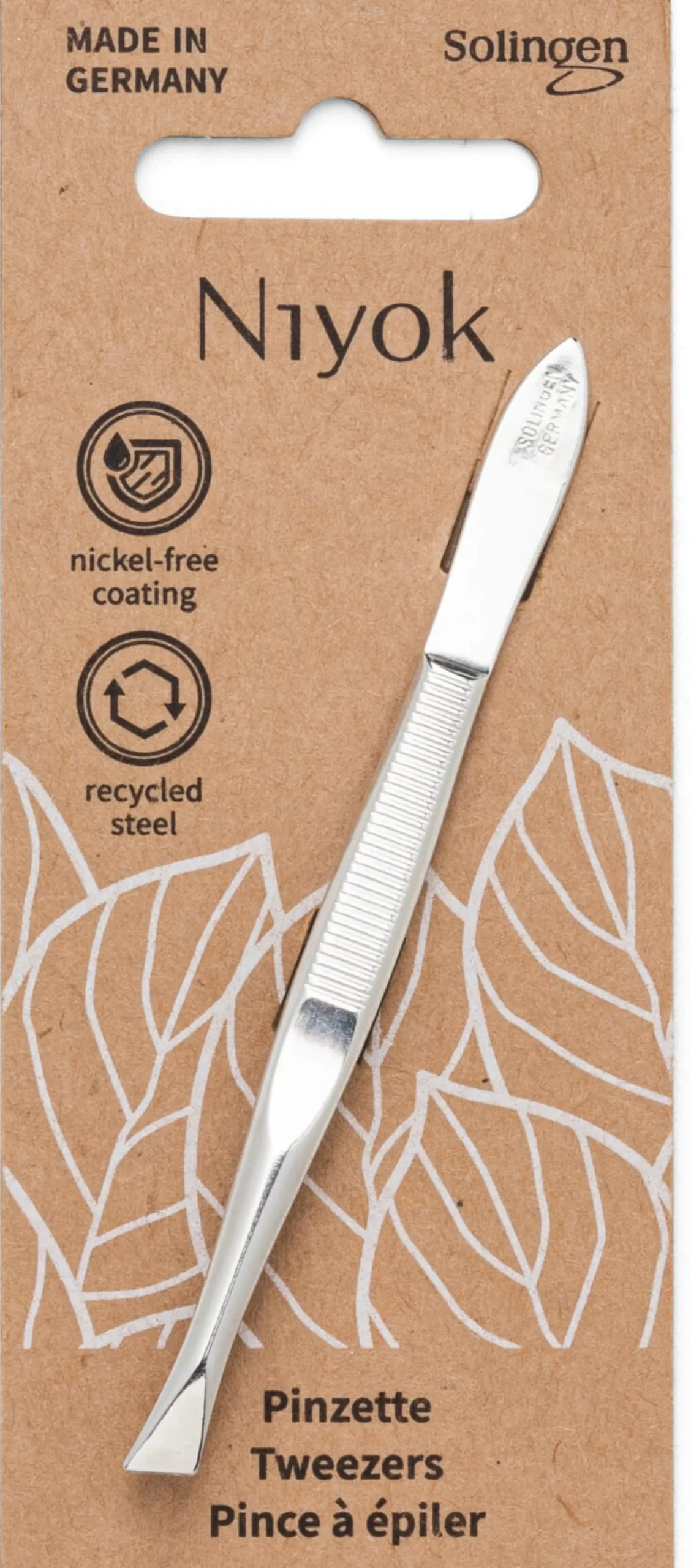 Aus der Schneidwaren-Stadt Solingen kommt diese einfache Pinzette. Mit ihrer abgeschrägten Spitze können Sie auch feine Härchen fest greifen und zupfen. Die Pinzette öffnet sich bis 6,4 Millimeter und ist an den Griffflächen geschliffen, sodass sie sicher in der Hand liegt. Der Kohlenstoffstahl besteht zur Hälfte aus recyceltem C45-Stahl, die Oberfläche wird nicht vernickelt.