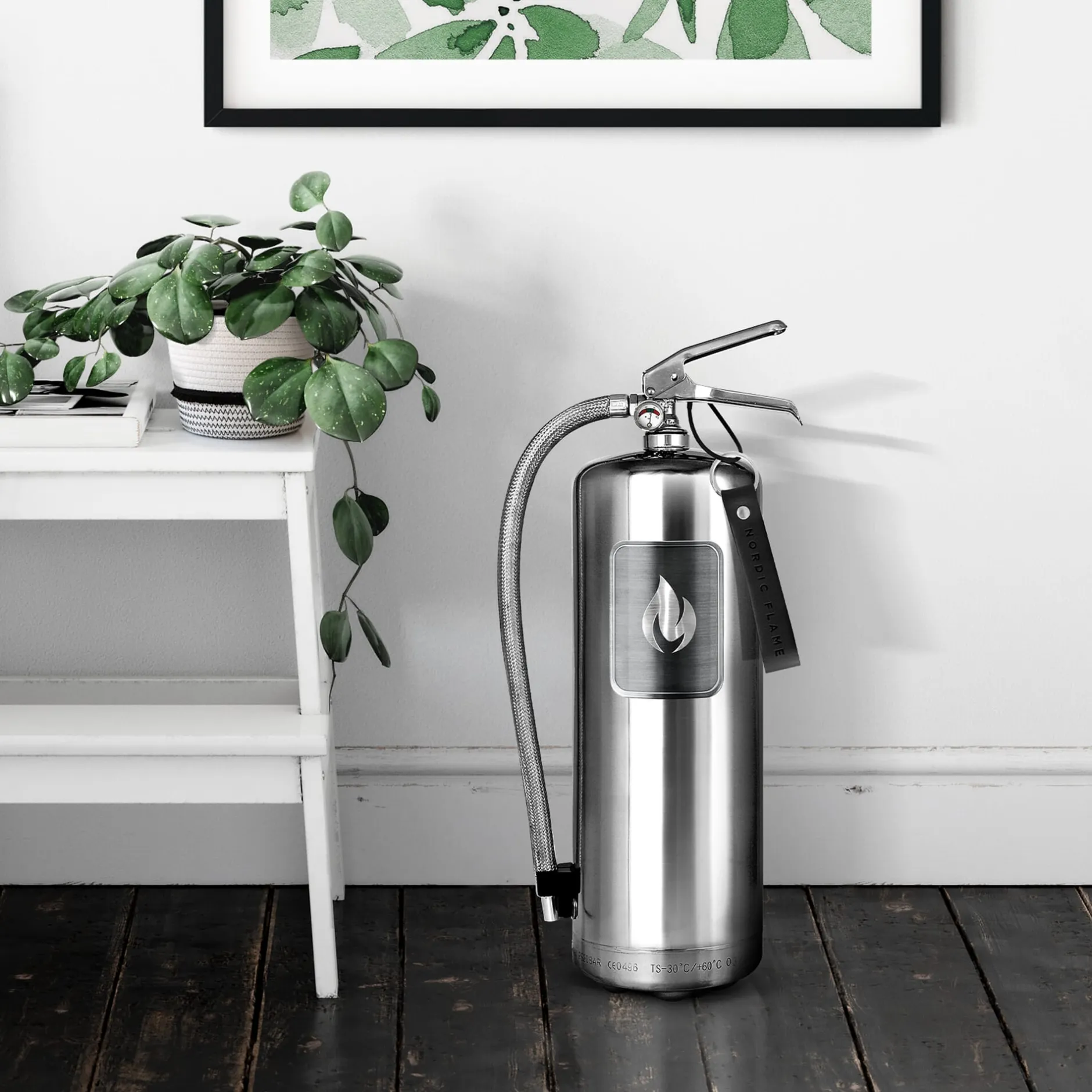 Aus handpoliertem Edelstahl hergestellt und mit einem schwarzen Lederstrap (zum Entsichern) versehen, glänzt er aber nicht nur mit klarem Design, sondern natürlich auch mit seinen inneren Werten: Der Feuerlöscher ist mit ABC-Pulver gefüllt und damit für die Brandklassen A, B und C geeignet: