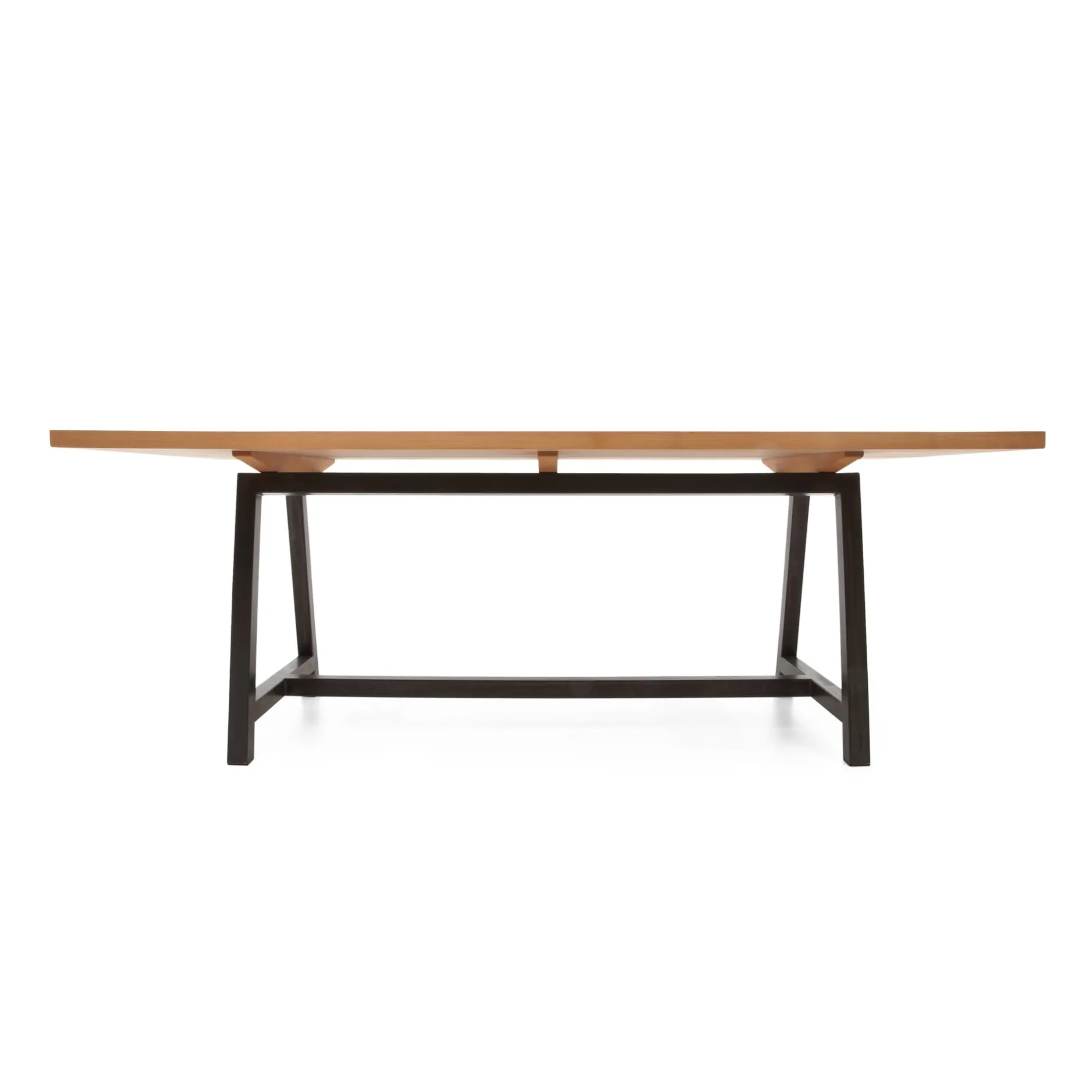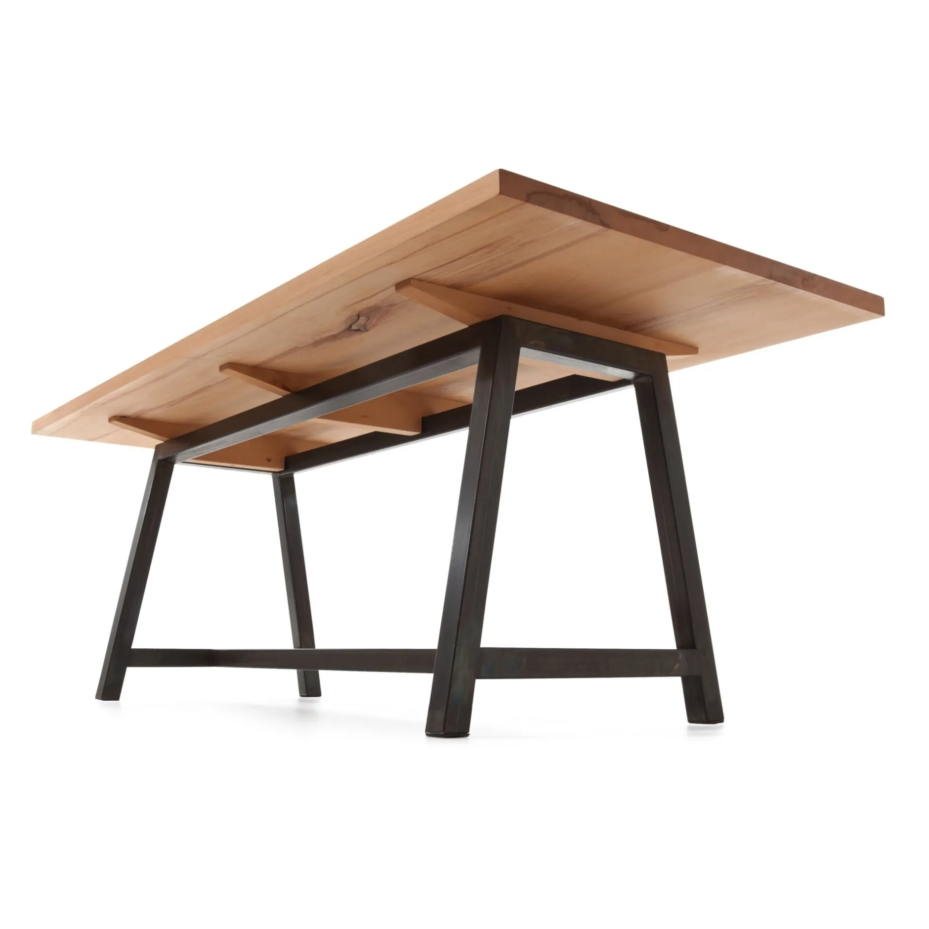 Tischplatte Kernbuchenholz geölt, 38 mm stark. Gestell Stahl, brüniert, Kantenlänge 5 cm.