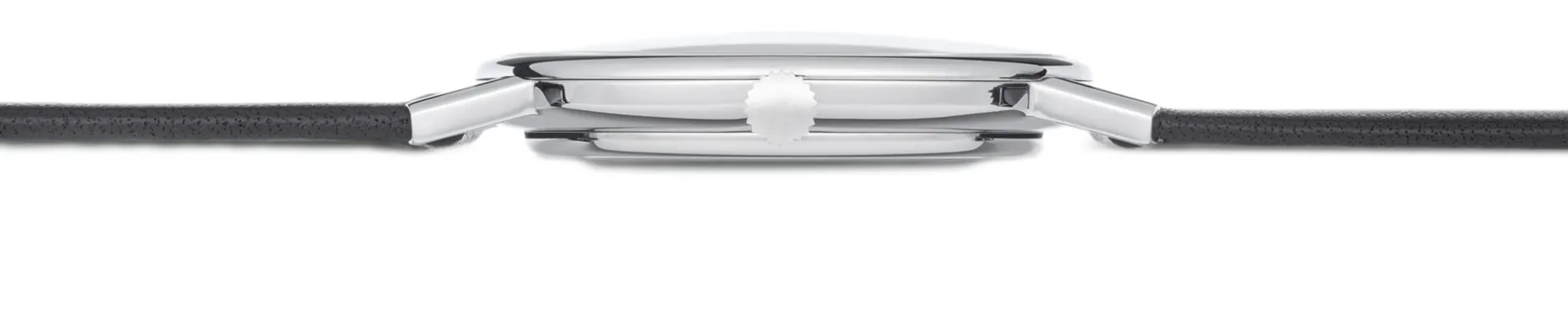 Handaufzugwerk ETA 7001 (17 Rubinlagersteine, 44 Stunden Gangreserve). Versilbertes Messingzifferblatt. Gewölbte Abdeckung und Sichtboden aus Saphirglas. Gehäuse (Ø 35 mm, Höhe 6,6 mm) Edelstahl. Schwarzes Lederarmband (Anstoßbreite 18 mm) mit Edelstahl-Dornschließe. Gewicht mit Armband 28 g.