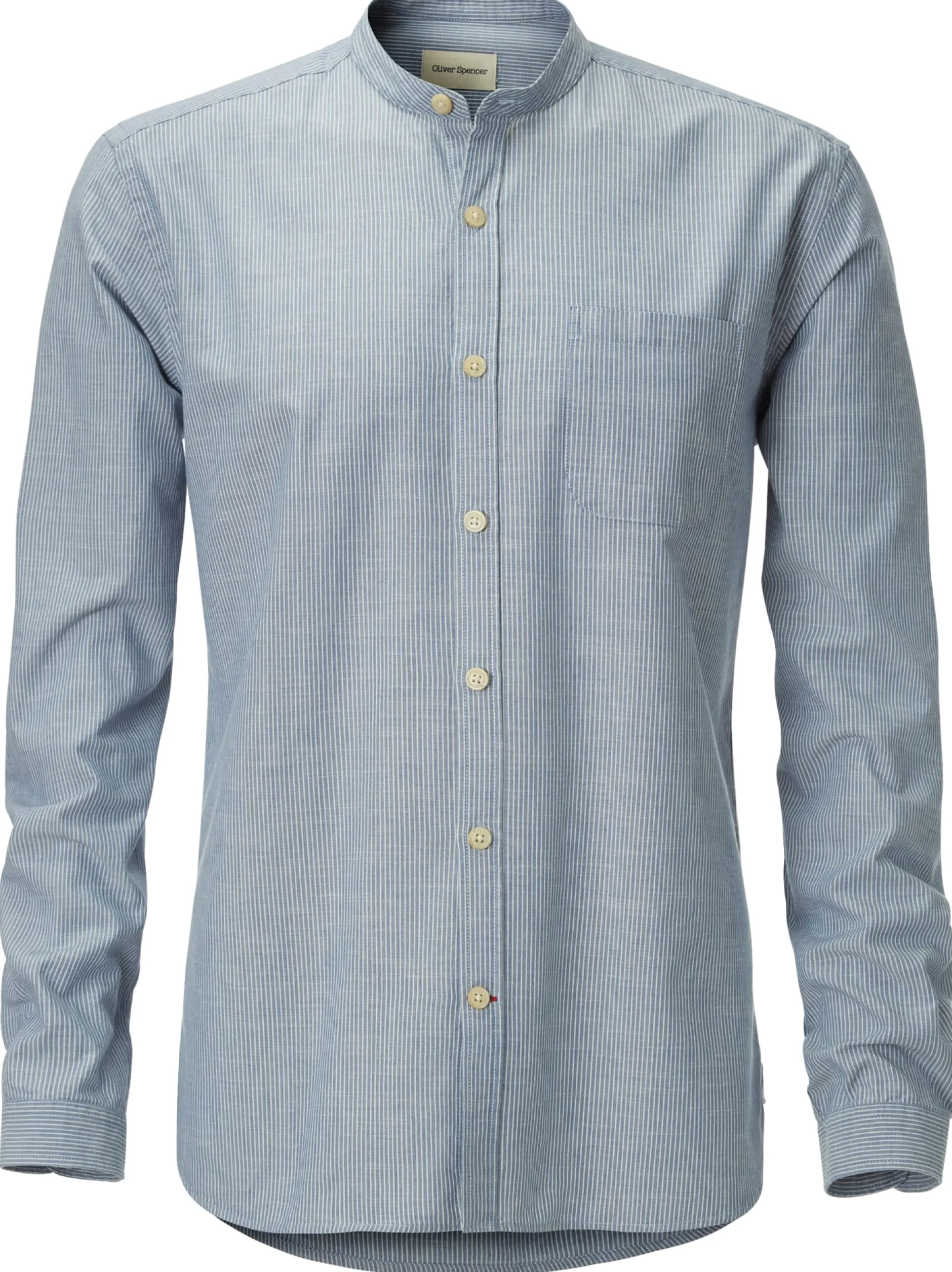 Stehkragenhemd mit gedoppelter Passe, mustergetreu aufgesetzter Brusttasche und gerundetem Saum. Das Dessin zeigt ein feines Streifenmuster.