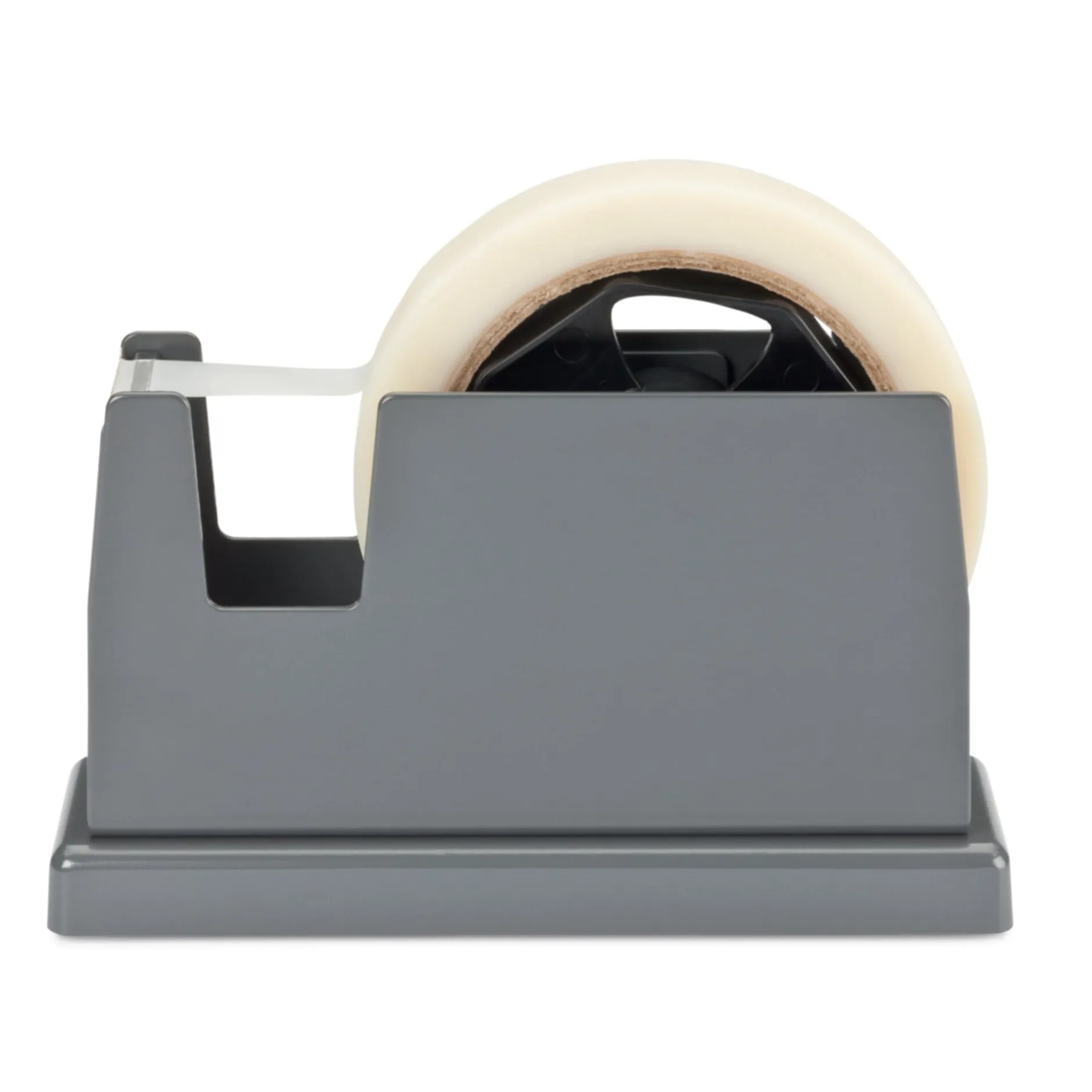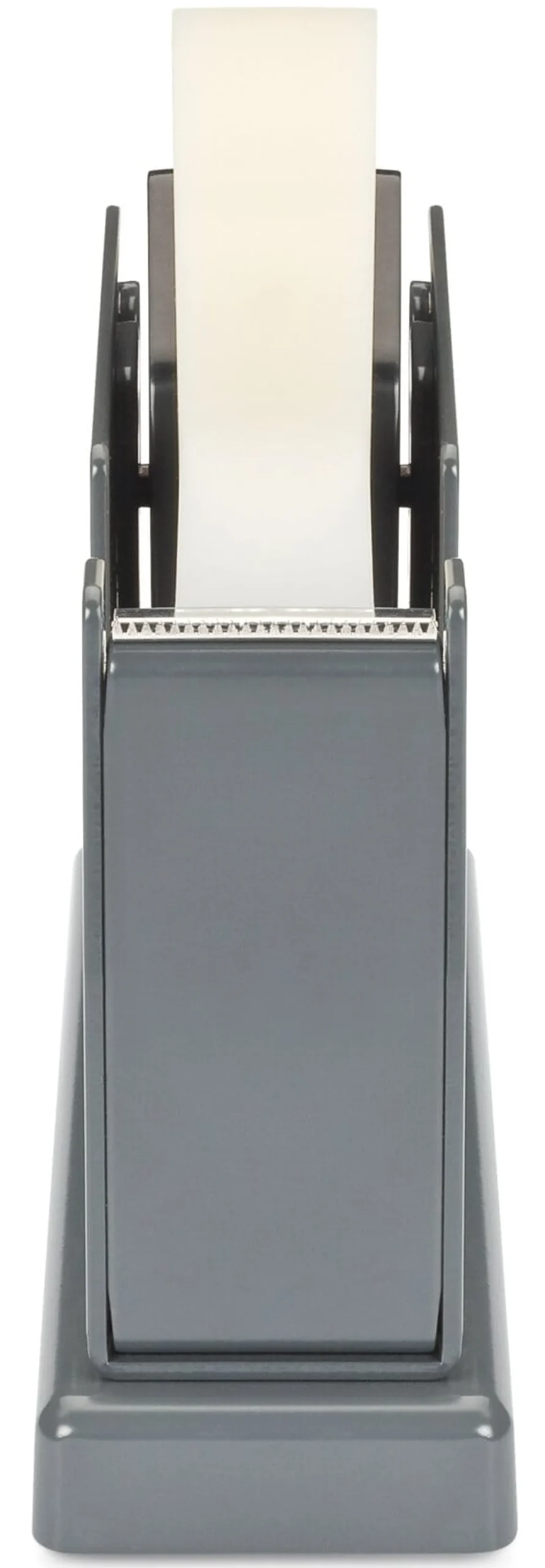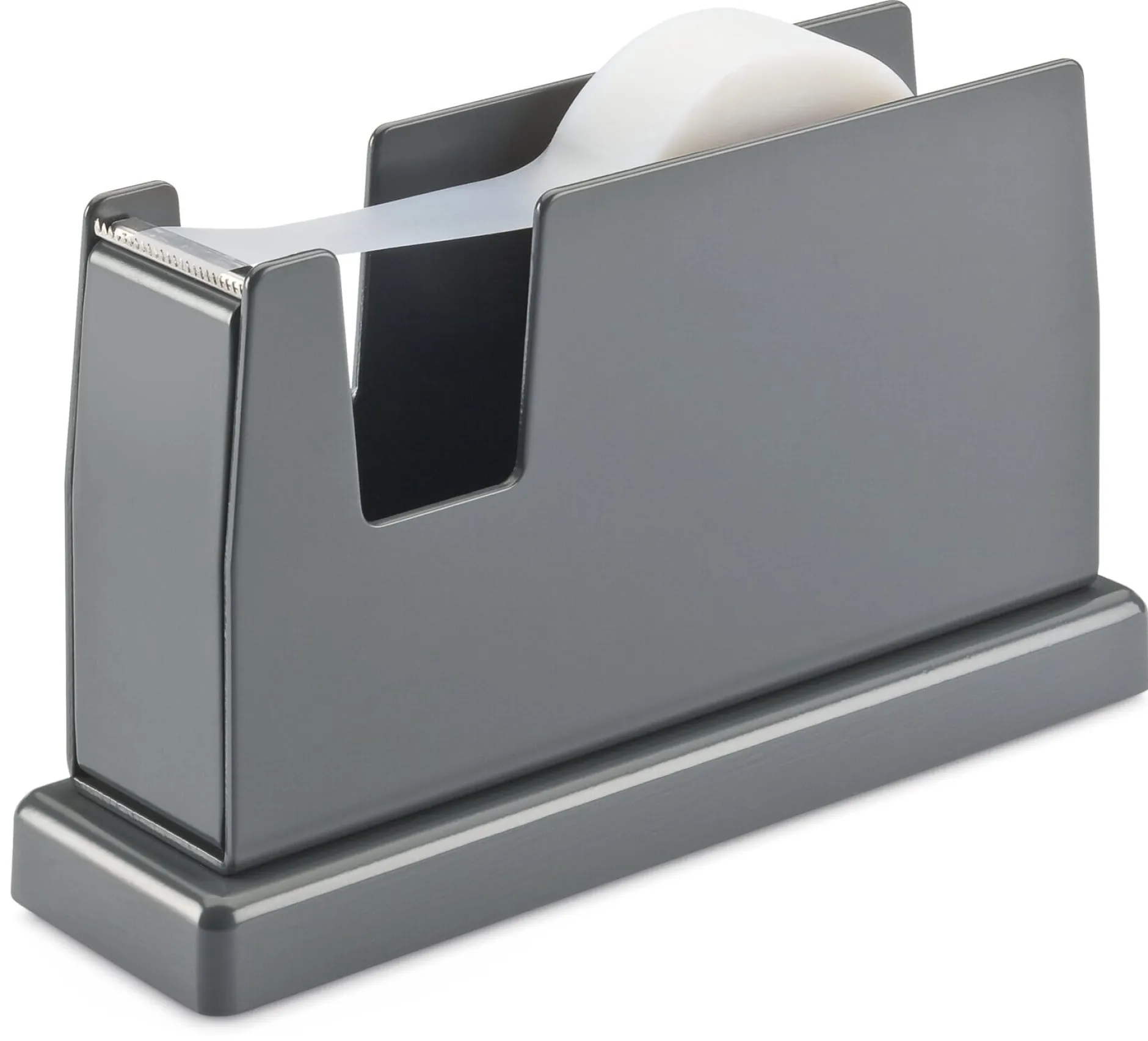Klebebandabroller aus Metall sind mittlerweile eine Rarität, und wenn sich noch welche finden, sieht man ihnen nur zu oft jene Überdosis Gestaltungswillen an, die schon vielen vom nützlichen Alltagsgegenstand zum „Designobjekt“ mutierten Dingen widerfahren ist. Dieser hier ist von solcher Überhöhung gänzlich frei. Er kommt aus Japan und ist für den von Berufs wegen viel mit Klebeband hantierenden Einzelhändler gemacht – und für den muss er vor allem robust, langlebig, zweckmäßig, variabel und reparabel (kurz gesagt: seinen Preis wert) sein. Der einfach konstruierte, aus Stahlblech gemachte Korpus bekommt durch seinen massiven Stahlfuß Gewicht; Standfüße aus Gummi verhindern, dass er beim Abreißen des Films wegrutscht, was in Summe die Bedienung mit einer Hand ermöglicht. Zwei Kunststoffrollen erlauben den Einsatz von bis zu 2,5 cm breiten Klebefilmrollen mit den gängigen Innendurchmessern von 25 und 75 mm (letztere mit maximal 11,4 cm Außendurchmesser). Die herausnehmbaren Rollen lassen sich ineinanderstecken und wie das angeschraubte Messer aus Stahlblech im Bedarfsfall ersetzen.
