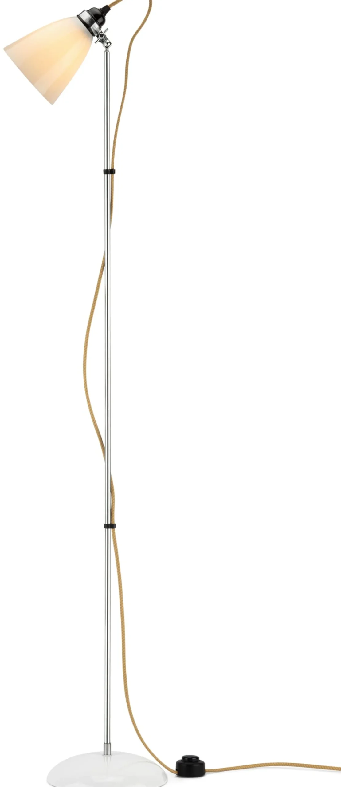 Schirm (Ø 12,5 cm) Bone China, Stativ (Länge 116 cm) Aluminium, Fuß (Ø 20 cm) Porzellan, Stahlgewicht, Filz. Weißes Textilkabel (Länge 200 cm) mit Zwischenschalter und Eurostecker aus Kunststoff. Kunststofffassung E27 (max. 40 W). Höhe 126 cm. Gewicht 3,2 kg. Lieferung ohne Leuchtmittel.