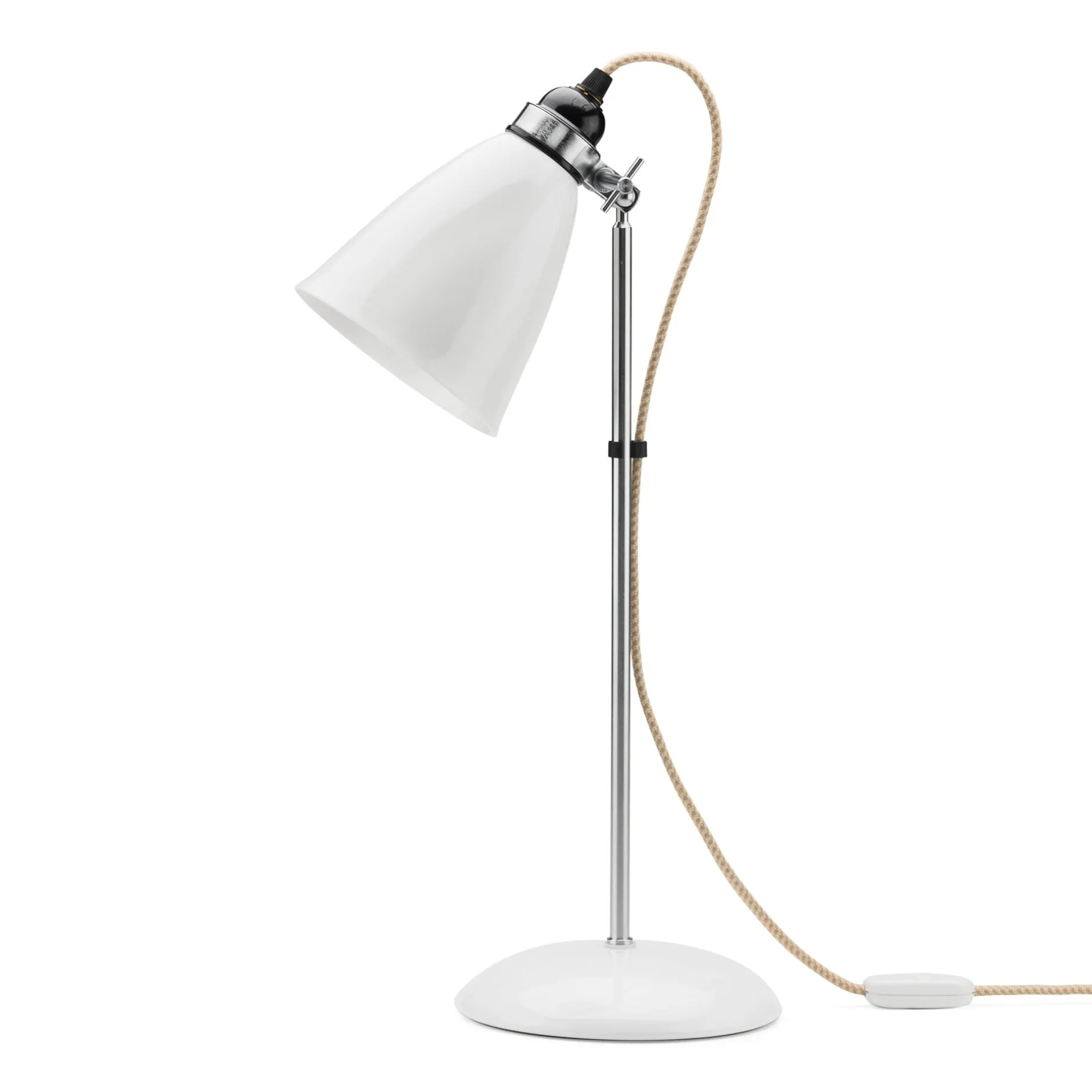 Schirm Bone China, Ø 12 cm. Stativ Aluminium. Porzellanfuß, Ø 15 cm, mit Stahlgewicht und Filzunterlage. Höhe 46 cm. Gewicht 1,5 kg. Textilkabel mit Eurostecker, Länge 2 m, Kunststofffassung E27 (max. 40 W). Lieferung ohne Leuchtmittel.