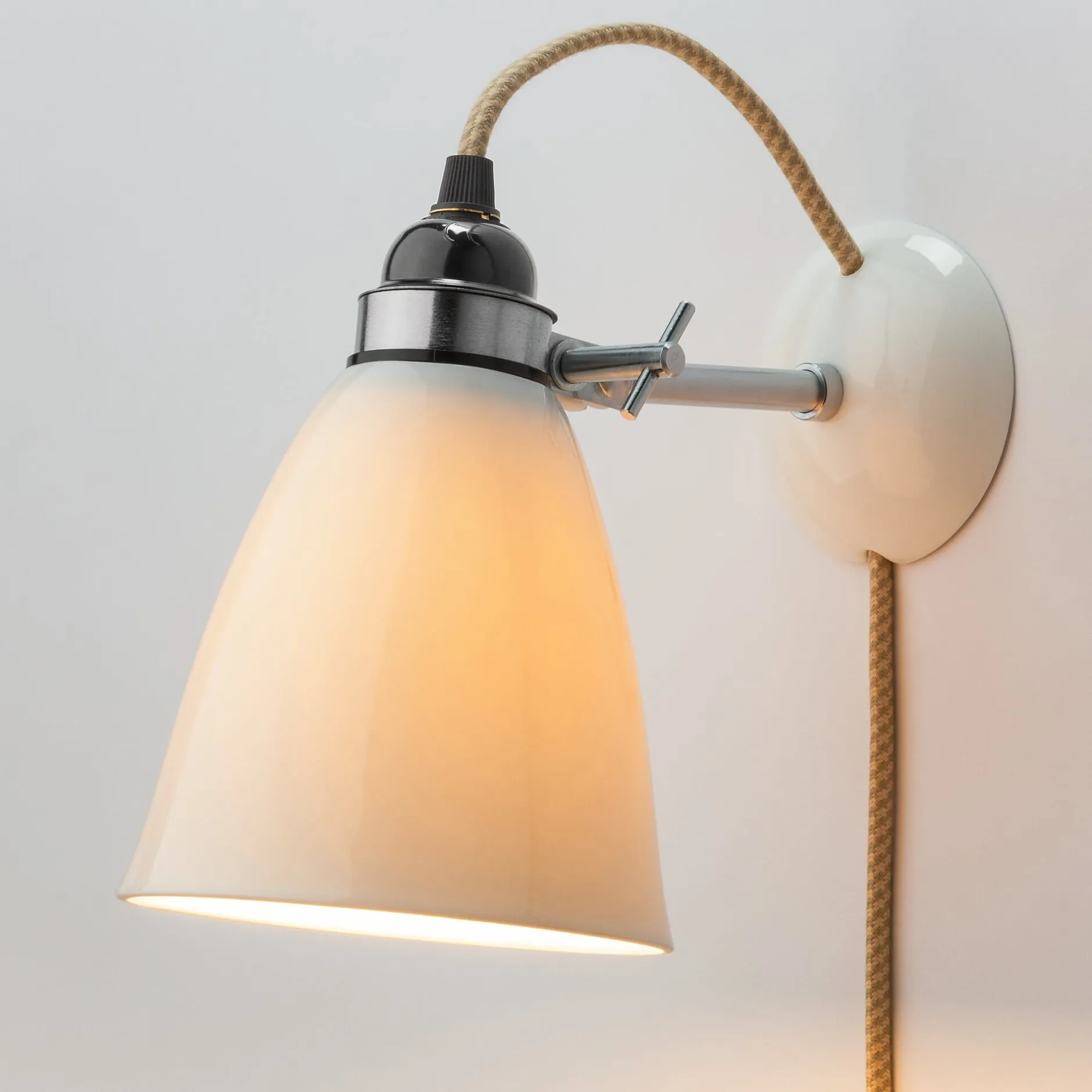 Mit Kabel. Zwischenschalter und Stecker. Wandrosette aus Porzellan, Ø 8,5 cm. Textilkabel, Länge 2,2 m, Eurostecker. Ausladung max. 26,5 cm. Gewicht 660 g.