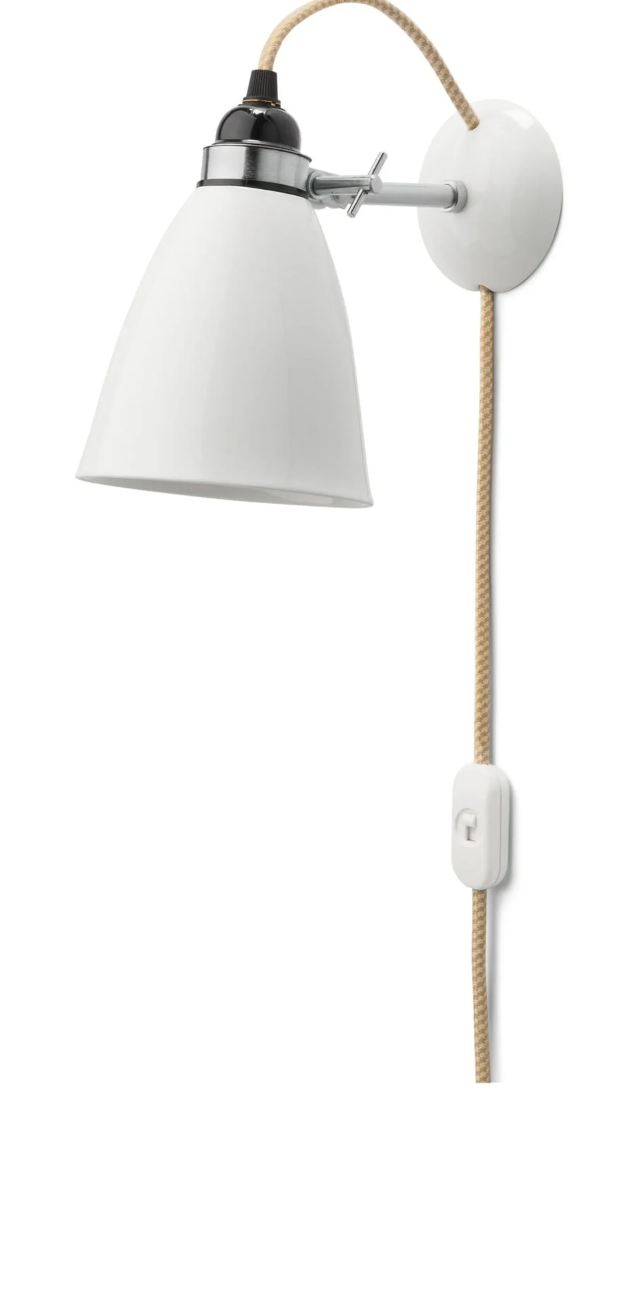 Bei dieser Leuchte zur Wandmontage besteht der Schirm aus Bone China, die Wandrosette aus Porzellan. Geschaltet wird die Leuchte über einen in das Textilkabel eingesetzten Zwischenschalter aus Kunststoff.