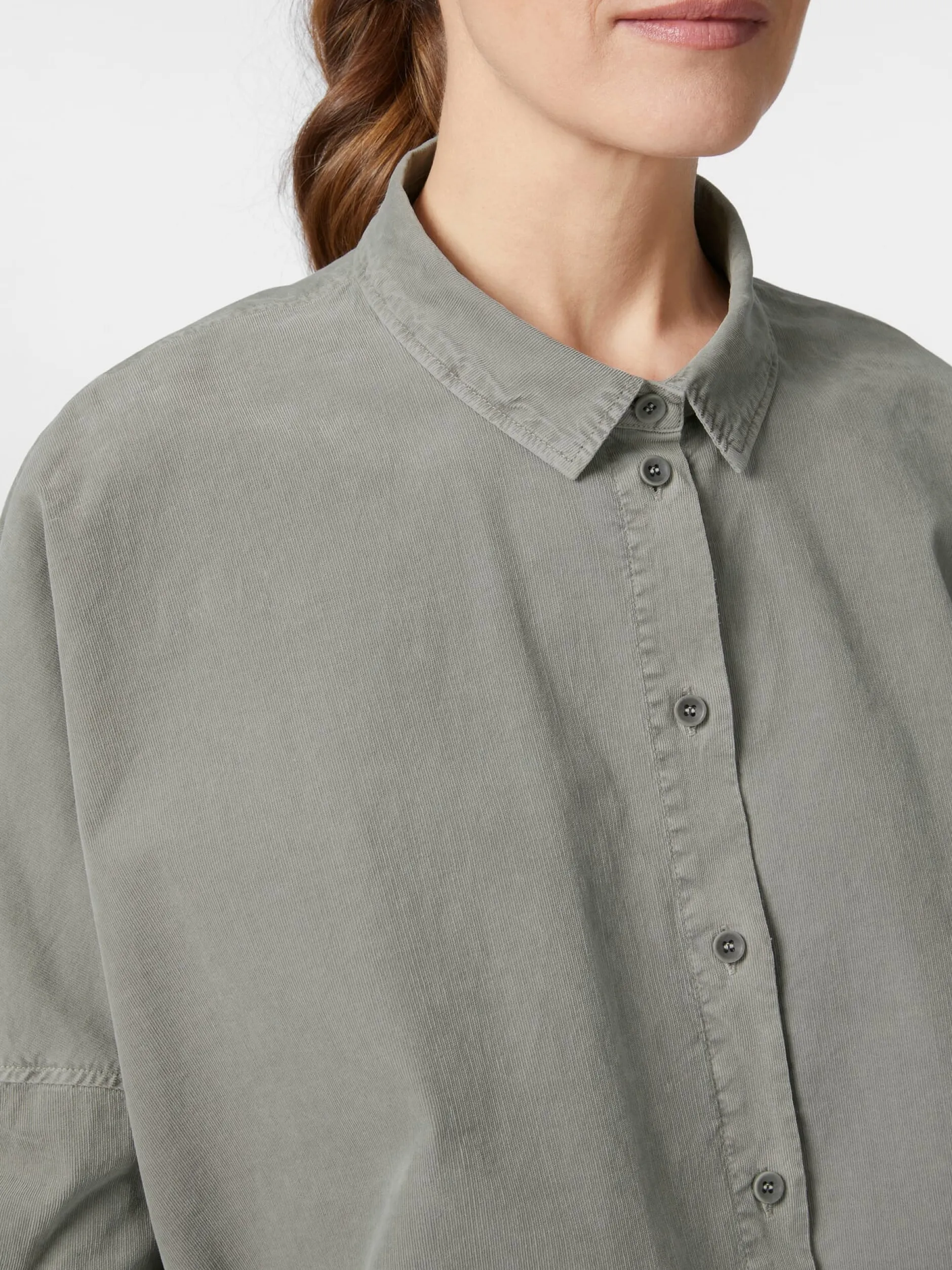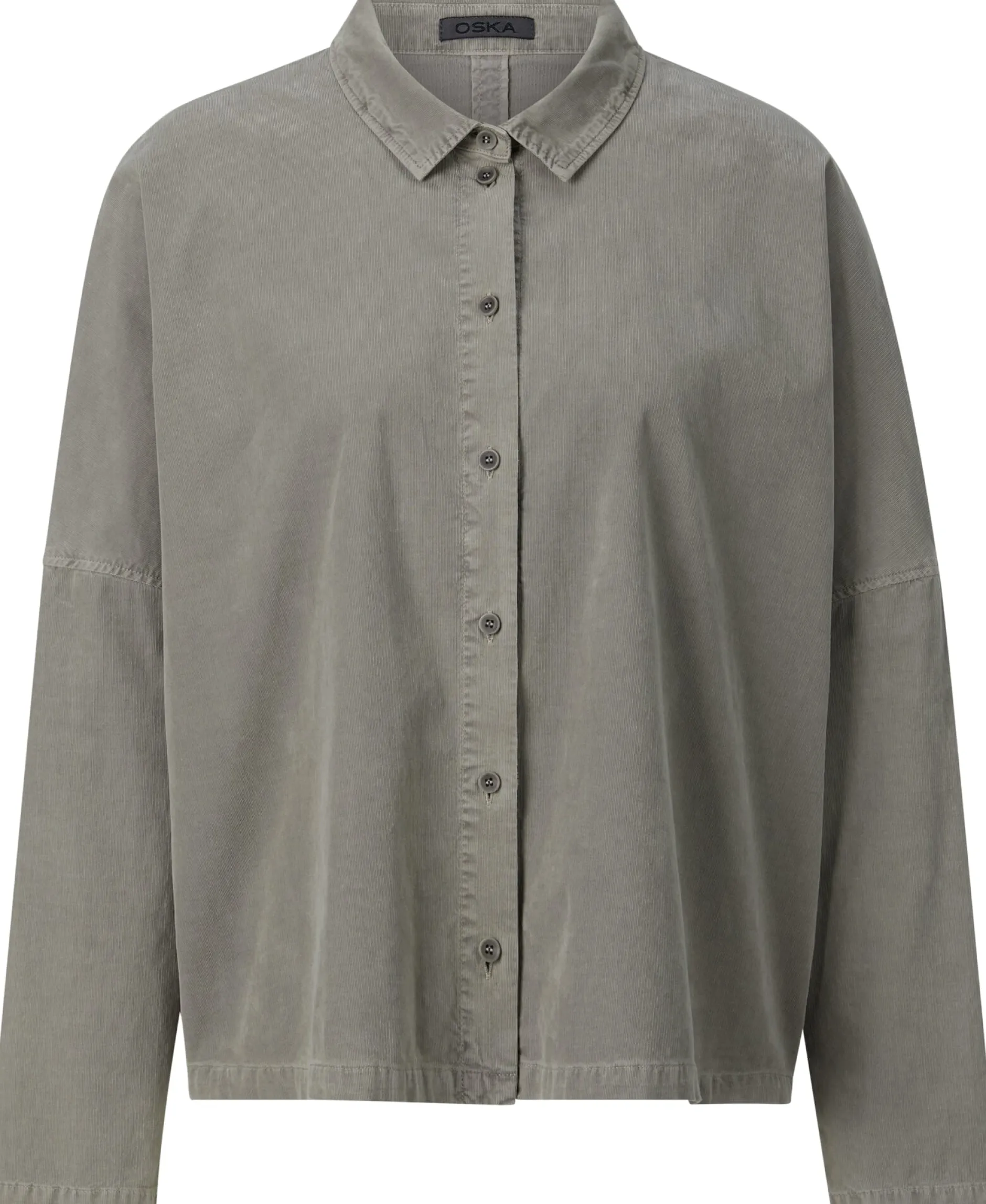 Cord mit seinen samtartigen Längsrippen hat eine markante Optik und Struktur. Oska konfektioniert diese Bluse aus einem Feincord, der aus hautsympathischer Baumwolle besteht, etwas Elastan sorgt für einen leichten Stretch-Effekt und erhöht so den Tragekomfort und die Formtreue. Die Form der Bluse ist kastig und Oska-typisch überschnitten, eine im Rücken aufspringende Kellerfalte macht sie noch bequemer.