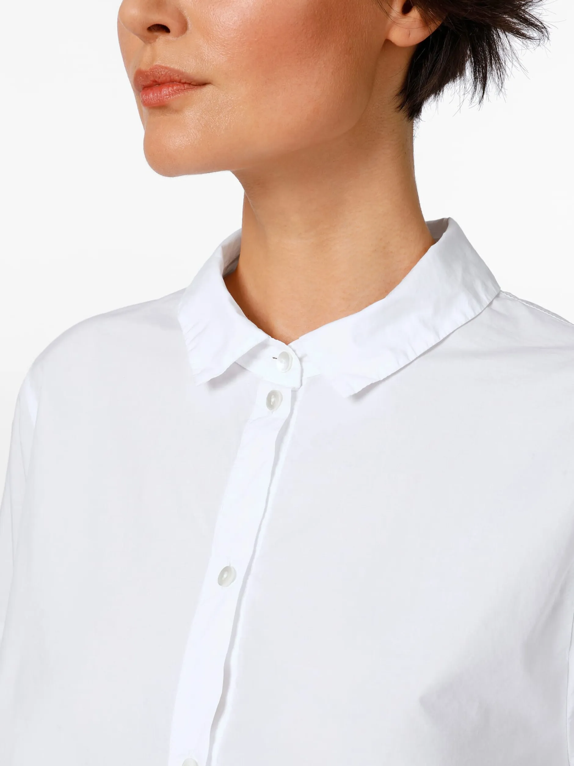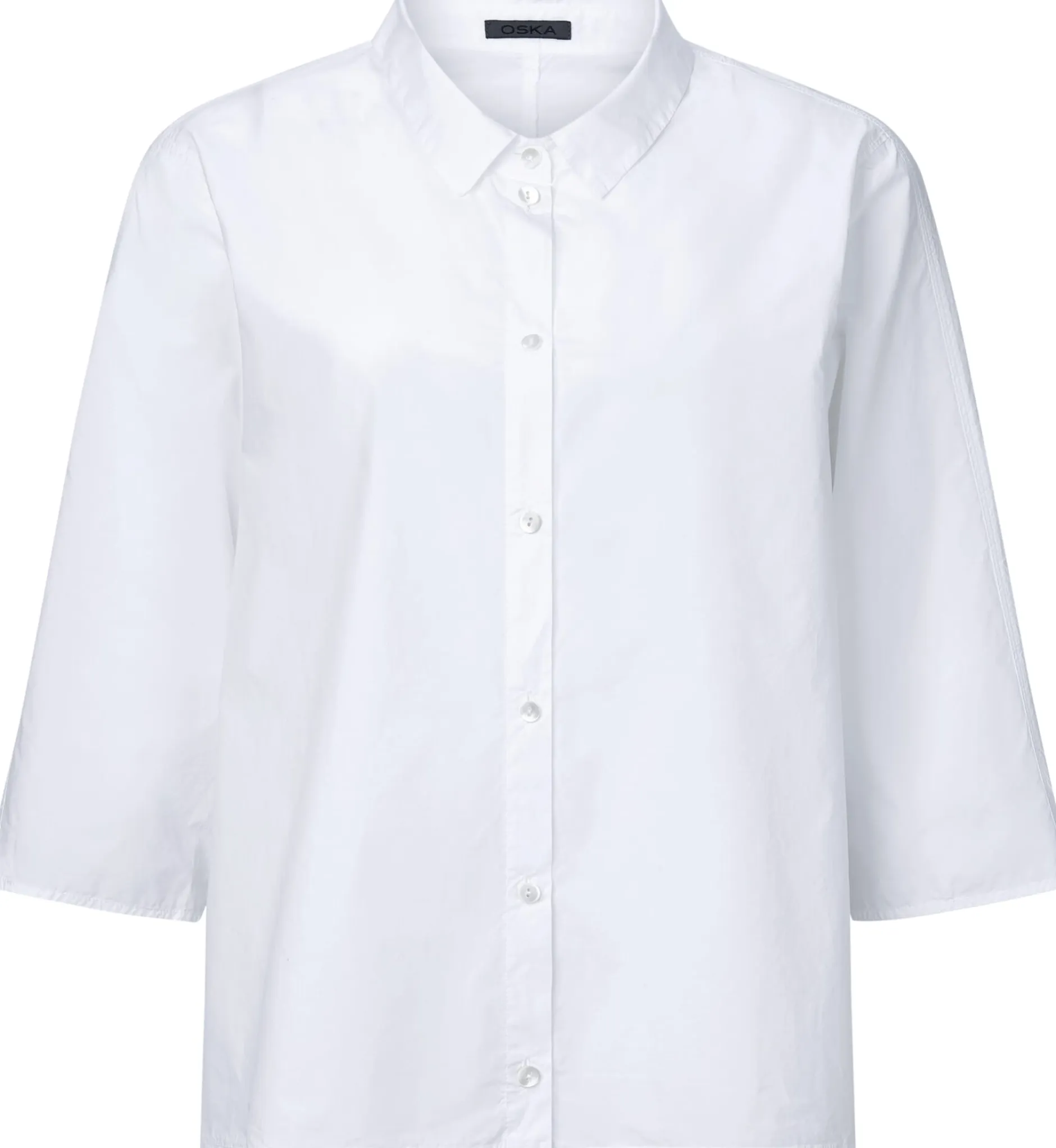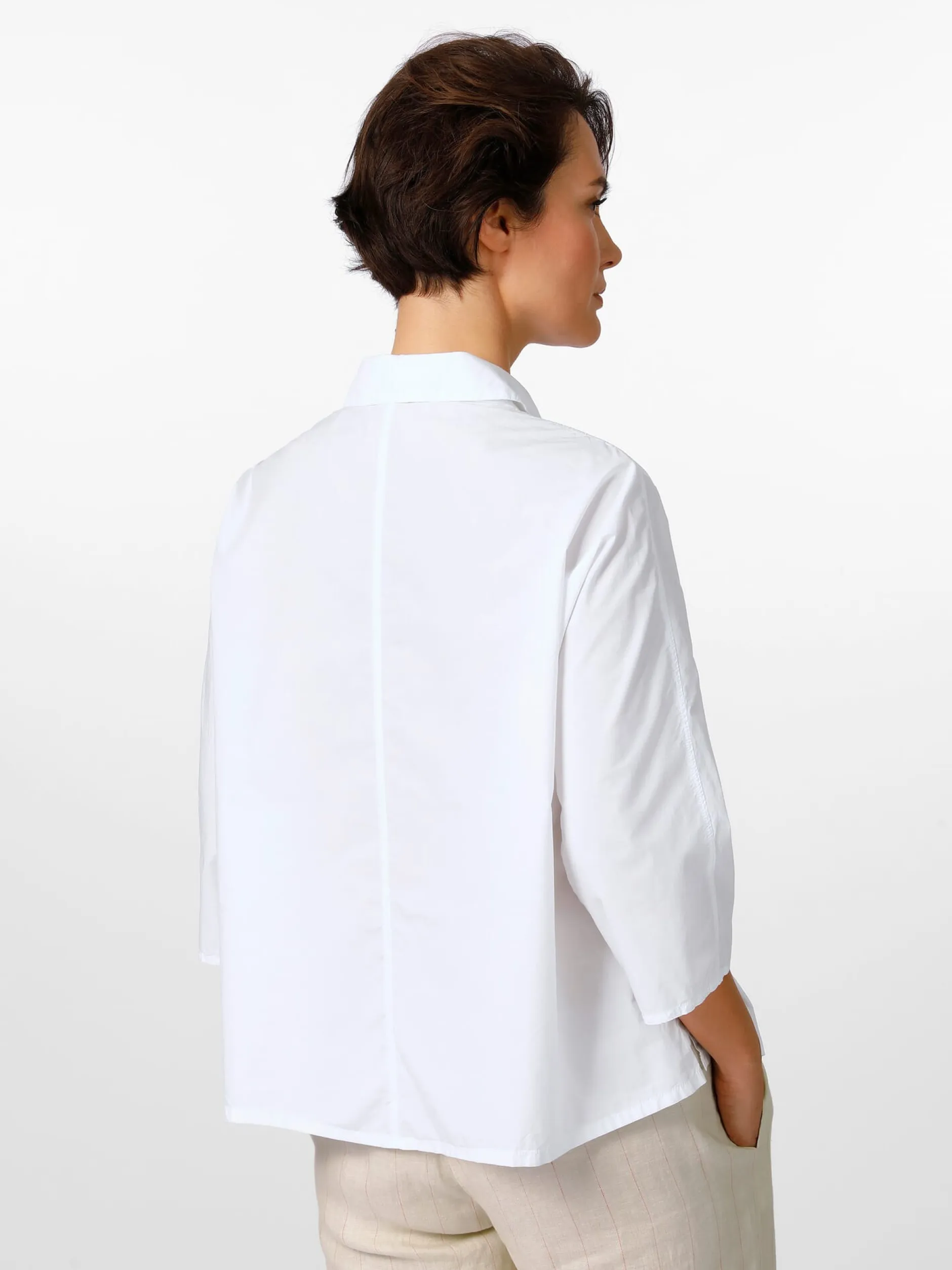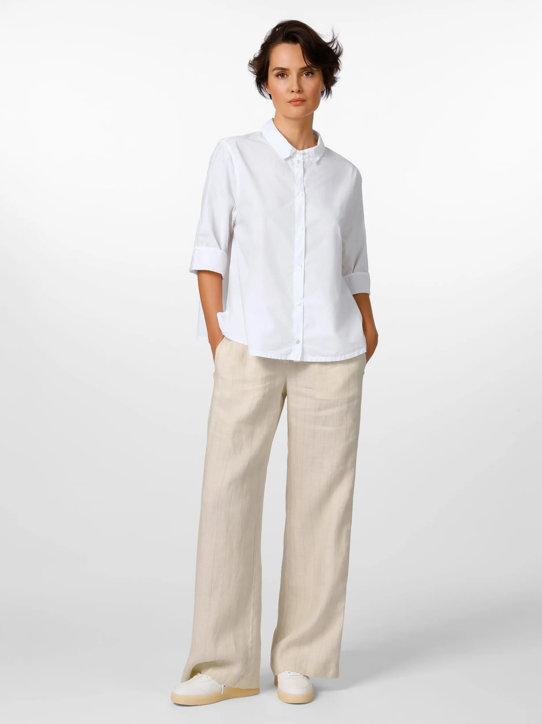 Ein sommerliches Basisstück ist diese leichte Bluse aus reiner, hautsympathischer Baumwolle. Die Bluse ist Oska-typisch überschnitten und dementsprechend lässig und bequem. Die Bluse ist mit leicht gerundetem Saum und kurzen Seitenschlitzen gearbeitet, die Ärmel können auch aufgekrempelt getragen werden. Eine Längsteilungsnaht hinten verschlankt die Silhouette optisch.