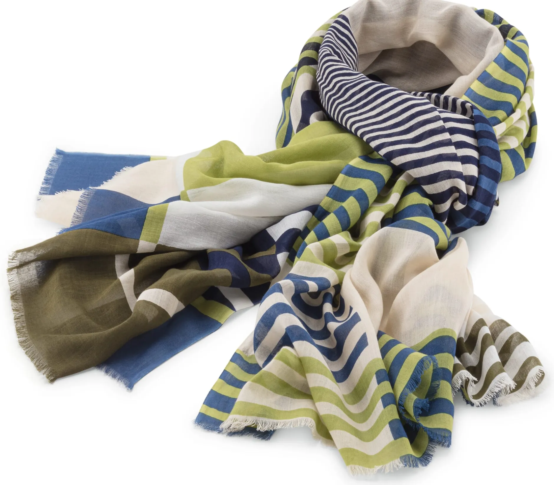 Das feine und entsprechend transparente Gewebe dieses Schals besteht je zur Hälfte aus Baumwolle und Modal, was ihm einen angenehm glatten Griff und einen fließenden Fall verleiht. Und nicht nur das Material, auch die Optik überzeugt: Das Dessin zeigt ein lebendiges Muster mit schmalen, sich überlagernden Streifen und Blockstreifen. Die Schalenden laufen in schmale Fransenkanten aus, die Kanten sind gesäumt. Dank der Länge von zwei Metern kann der Schal in den unterschiedlichsten Varianten gebunden werden. Zudem ist er so breit, dass er nicht nur um den Hals getragen, sondern auch über die Schulter gelegt werden kann. So sorgt er stets aufs Neue für abwechslungsreiche Auftritte.