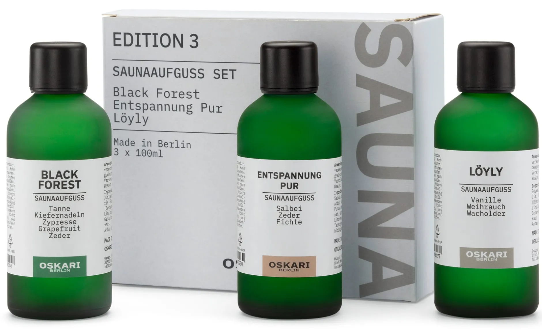 Set mit 3 Saunaaufgüssen: Entspannung Pur, Black Forest und Löyly. Je in der 100-ml-Glasflasche.