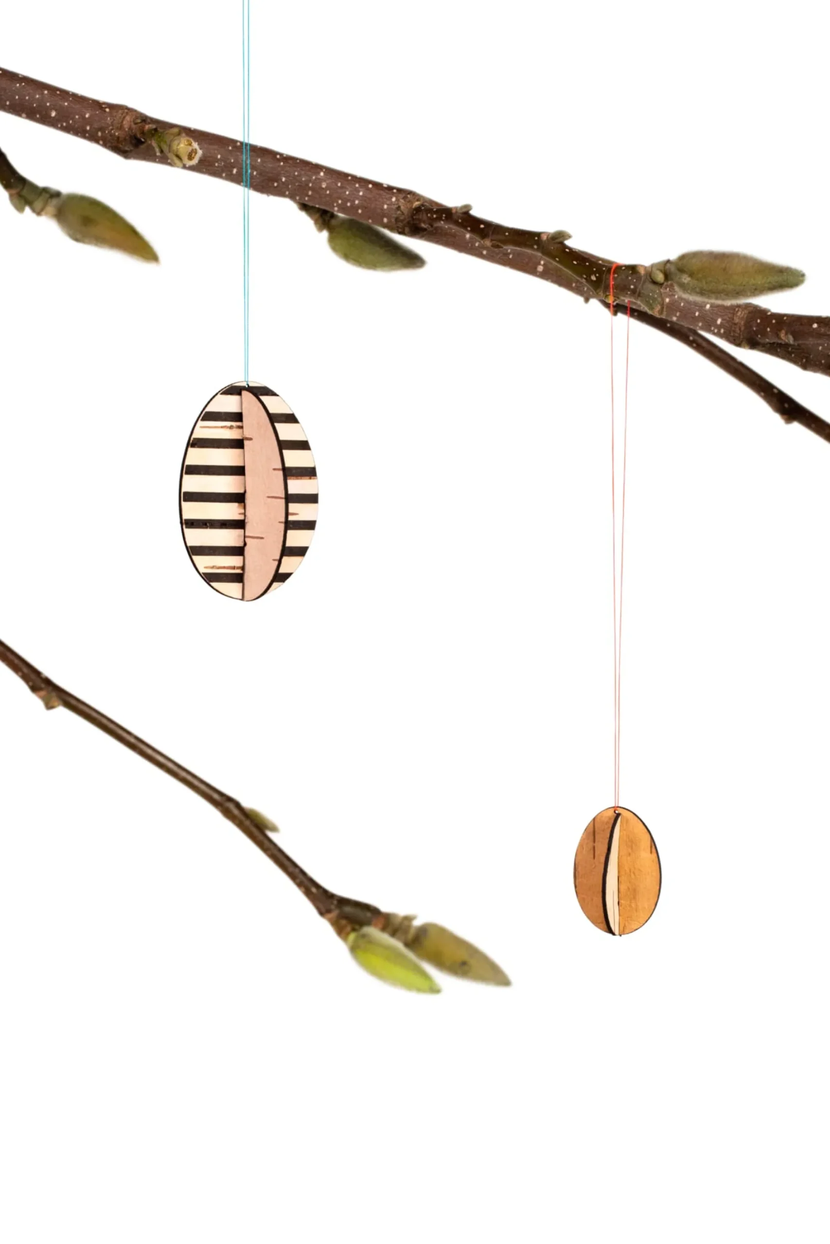 Ostergruß und dekorativer Schmuck: Diese Anhänger aus Birkenrinde lassen sich spielend leicht aus der vorgestanzten Fläche aus Birkenrinde herausdrücken und einfach zusammenstecken. Die samtig weiche Oberfläche der Rinde ist ein Handschmeichler und steht mit ihrem warmen Naturfarbton in einem schönen Kontrast zu zartem Frühlingsgrün. Sie erhalten die Anhänger – je ein großes und ein kleines Ei – in Form einer Karte flach verpackt in einem semitransparenten Papierkuvert. Von außen lassen sich schon die dekorativen Motive erkennen. Bunte Fäden zum Aufhängen und eine Anleitung zum einfachen Zusammenstecken liegen bei.