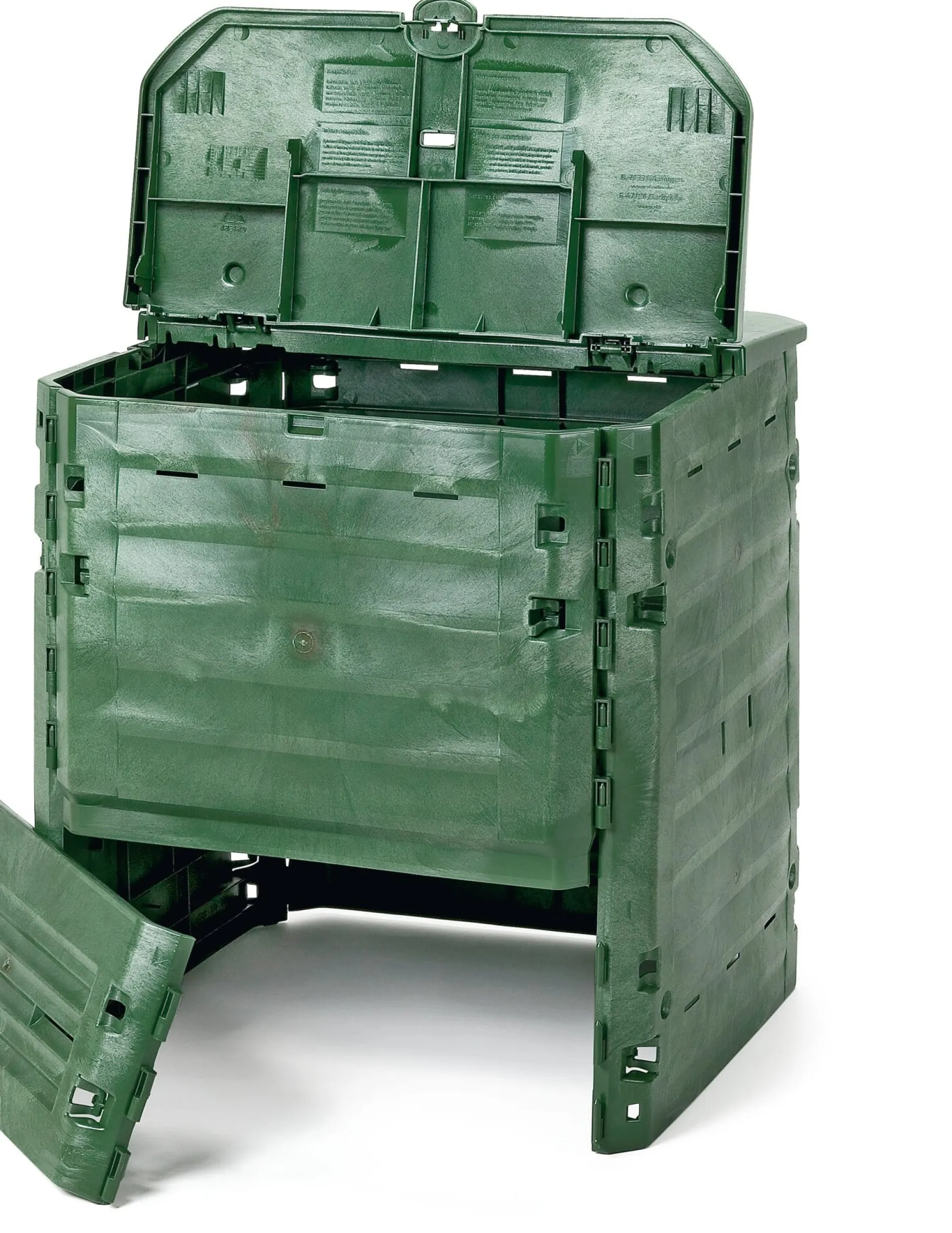Der Kompostbehälter kann ohne Aufwand werkzeuglos zusammengesteckt werden; er benötigt keine weitere Verankerung im Erdreich. Befüllen lässt er sich von oben durch zwei große Öffnungen (69 × 35 cm); die kompostierte Erde kann durch die großzügig bemessenen Entnahmeklappen (62 × 30 cm, je eine auf Vor- und Rückseite) ganz einfach und bedarfsgerecht entnommen werden. Wärme-Komposter sind bei kleineren Gartengrundstücken die ideale Alternative zur offenen Kompostmiete, denn sie benötigen weniger Platz und die Rotte verläuft schneller.