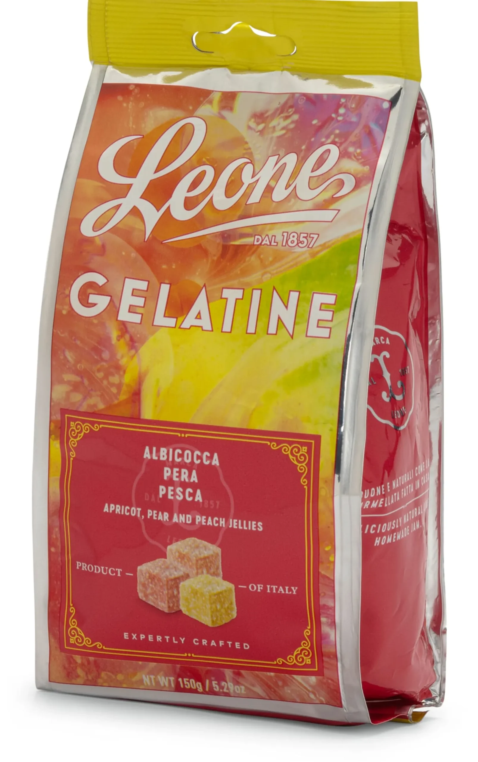 Eine erprobte Rezeptur mit ausgesuchten Früchten aus Italien lässt diese weichen Würfel beinah wie echte, vollreife Früchte auf der Zunge zergehen. Diese Hausspezialität von Leone ist vom klaren, intensiven Aroma der jeweiligen Frucht geprägt – und vor allem sind die Fruchtwürfel eines: alles andere als klebrig-süß. Die Packung enthält Fruchtwürfel der Sorten Birne, Pfirsich und Aprikose in veränderlichen Anteilen.