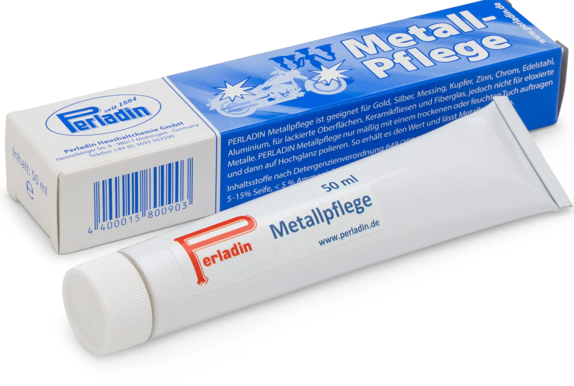 Metallpflegepasten müssen zwei ganz gegensätzliche Anforderungen erfüllen: Zum einen sollen sie Metalloberflächen wirksam reinigen – was am besten mit Schleifpartikeln funktioniert. Zum anderen dürfen die Schleifpartikel dabei keine Kratzer hinterlassen, vor allem nicht bei glänzenden Metallen oder lackierten Metalloberflächen. Im Gegensatz zu vielen anderen Metallpflegepasten enthält Perladin äußerst feine Schleifpartikel und eignet sich daher auch für empfindliche Oberflächen, ohne sie zu verkratzen. Sie reinigt, pflegt und poliert blanke Metalle (Gold, Silber, Kupfer, Bronze, Messing, Zinn, Aluminium, Chrom, Edelstahl, Magnesium und Nickel), aber auch Fieberglas oder lackierte Oberflächen sowie verwitterten Autolack. Ein spezieller Korrosions- und Anlaufschutz verzögert das Anlaufen der Metalle. Damit lässt sie sich in allen Bereichen in Haus, Garten, Werkstatt und Garage einsetzen, insbesondere ist sie für Autos und Oldtimer, Motorrad, Fahrrad und Boot geeignet. Mit trockenem oder feuchten Tuch auftragen, kurz einwirken lassen und anschließend auf Hochglanz polieren.