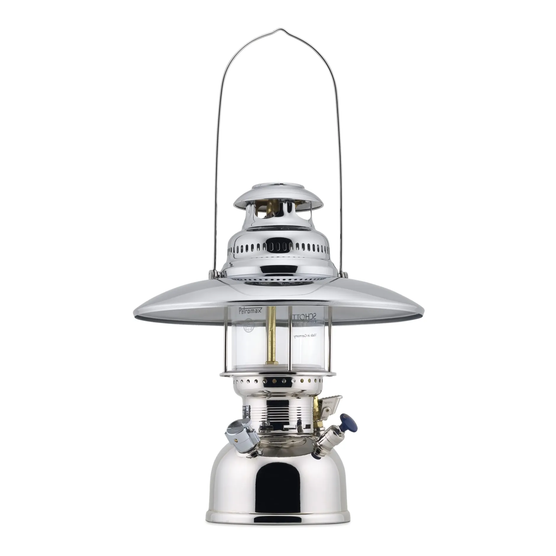 Stahl, verchromt. Höhe 4,5 cm, 34 cm Ø. Gewicht 680 g. Lieferung ohne Petromax Starklichtlampe.