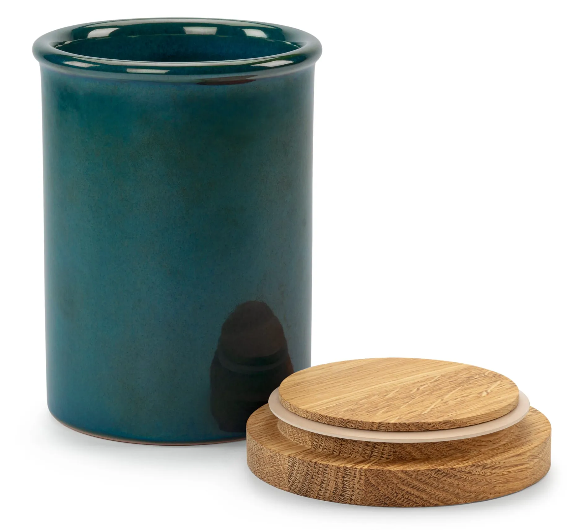 Gesinterte Keramik, grün glasiert. Deckel Eichenholz geölt, luftdicht schließend dank eines Dichtungsringes aus Naturkautschuk.