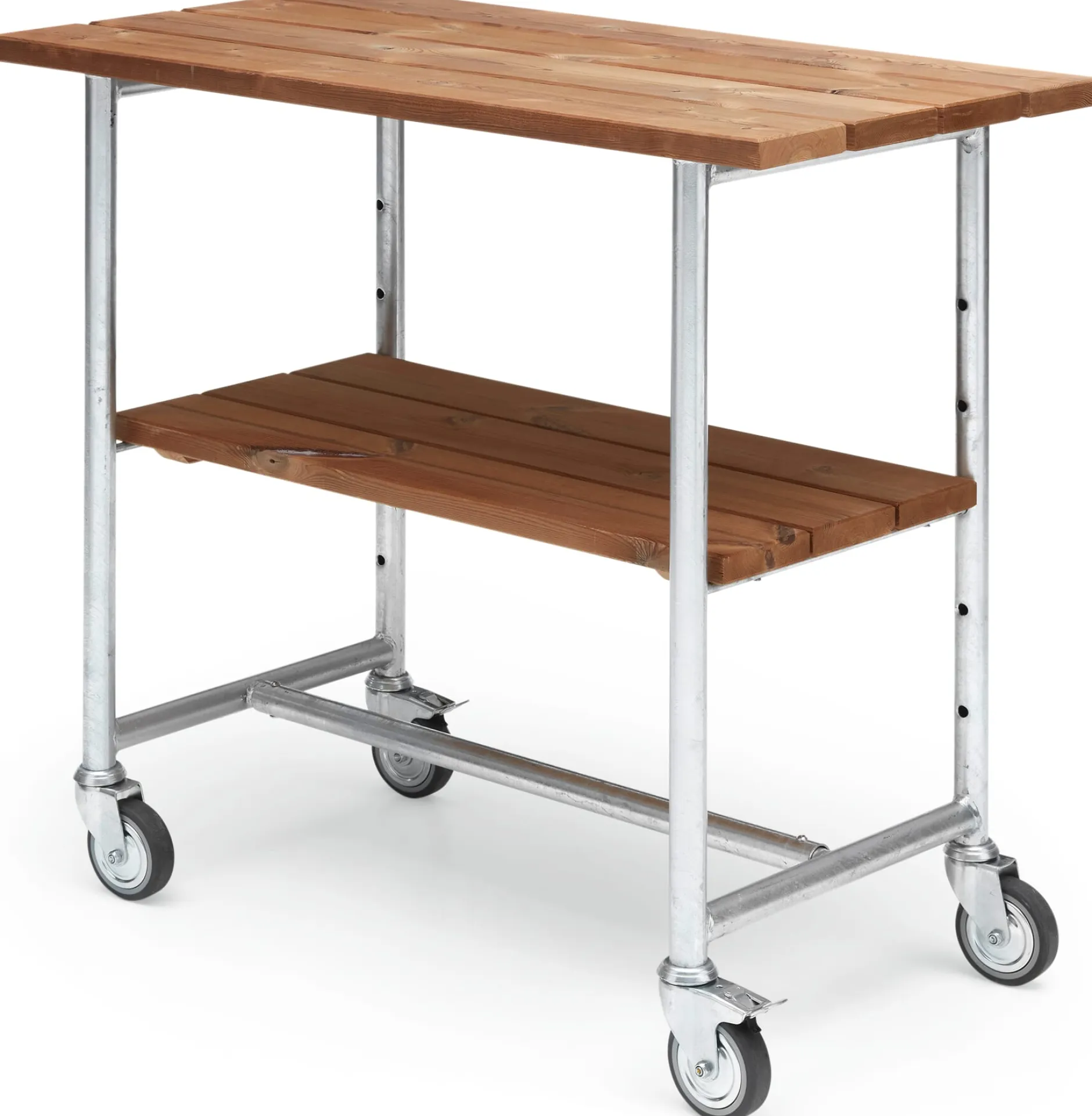 Robuster Wagen mit Arbeitsplatte und Ablagefläche aus der Serie JÜTLAND. Mit seinen Schwerlastrollen ist das flexible Möbel ohne große Anstrengung rollbar und kommt einfach überallhin mit, wo es gebraucht wird: auf den Balkon, die Terrasse, in den Wintergarten, Hof und Garten. Die ideale Ergänzung zu Tisch und Bank der Serie aus unserem Sortiment – natürlich beide auch auf Rollen.