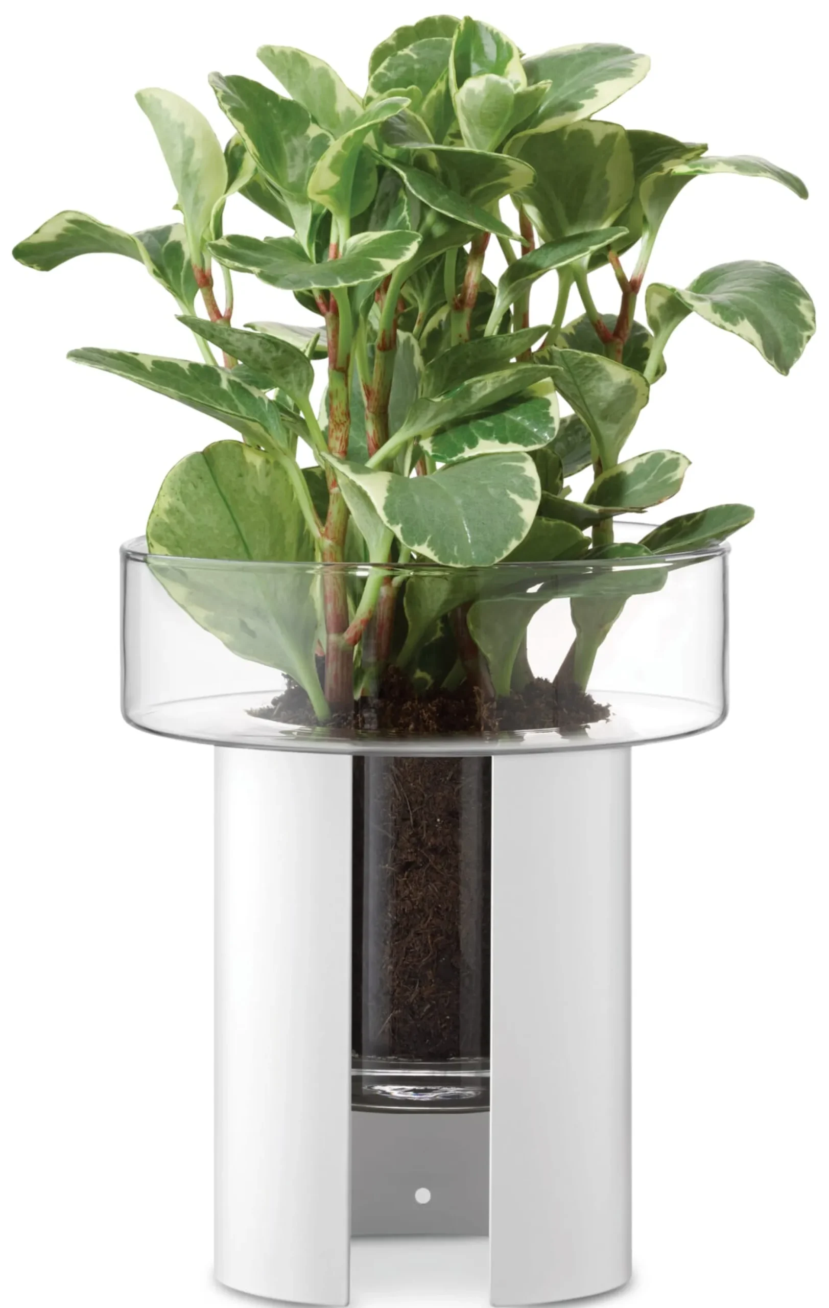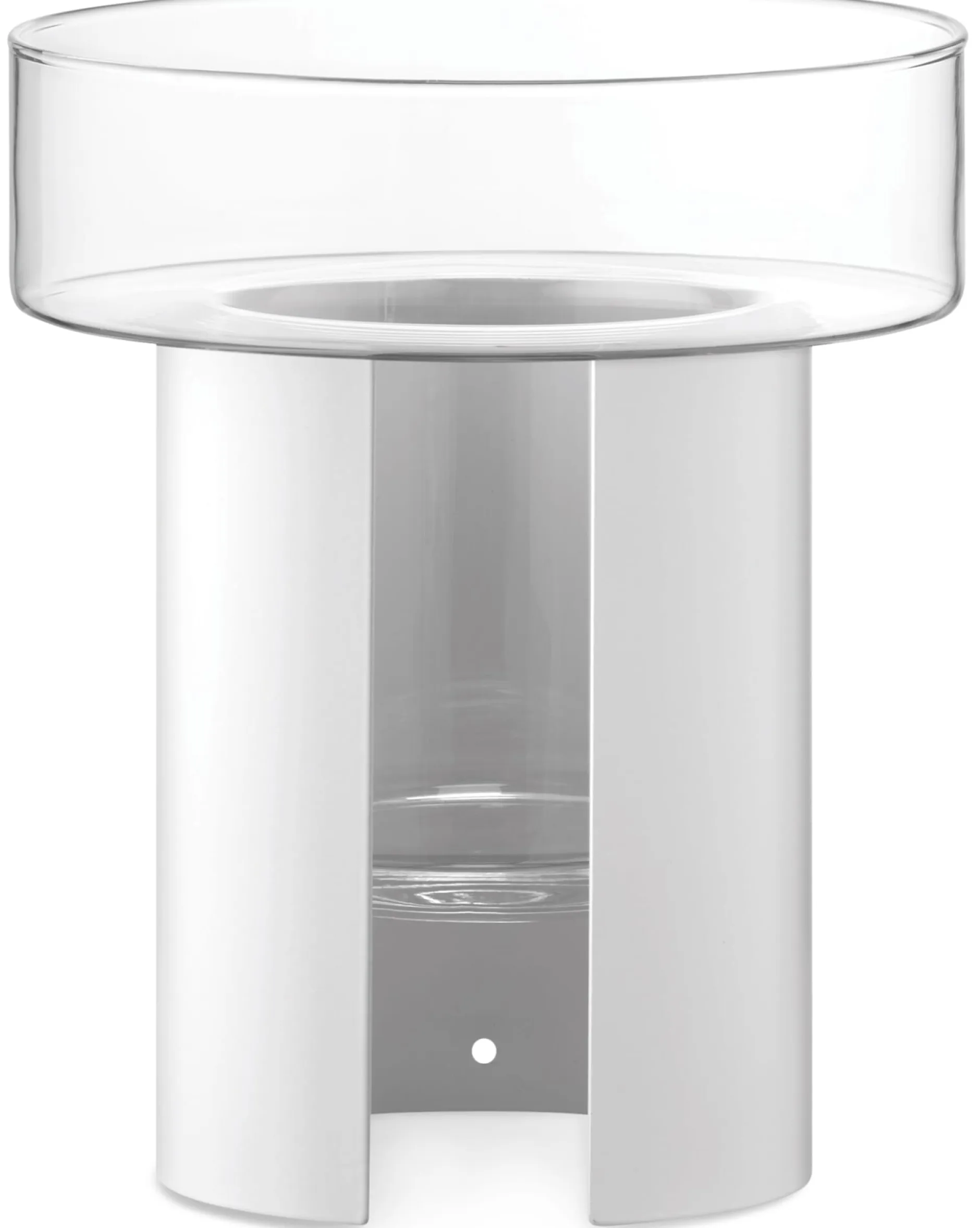Pflanzgefäß in ungewöhnlicher Materialkombination: TERRAZZA besteht aus einer runden Basis aus pulverbeschichtetem Stahlblech, die dem darauf plazierten, gläsernen Pflanzgefäß repräsentative Höhe verleiht. In einer Holzform mundgeblasen, taucht der untere Teil des Glaskörpers samt Wurzelwerk in die Stahlbasis ein, der obere gibt den Blick auf das gepflanzte Grün frei und setzt es in Szene. Die schmale Öffnung des Stahlpodestes verleiht dem Gefäß Leichtigkeit, macht das Wurzelwerk sichtbar und bietet ihm gleichzeitig die benötigte Dunkelheit.