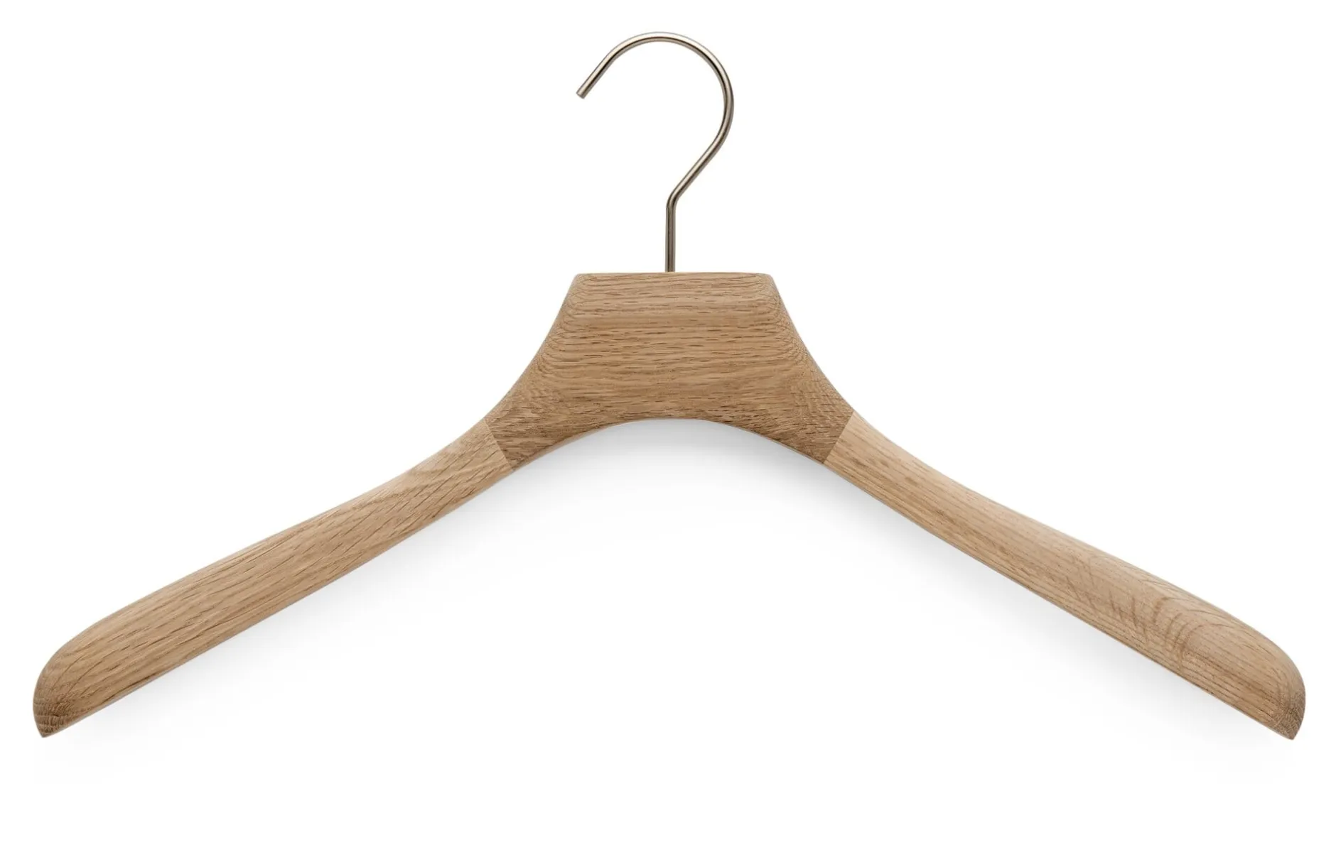Großer Kleiderbügel, mit breiter Auflagefläche aus massiver Eiche gefertigt und einem matt silberfarbenen stählernen Haken.