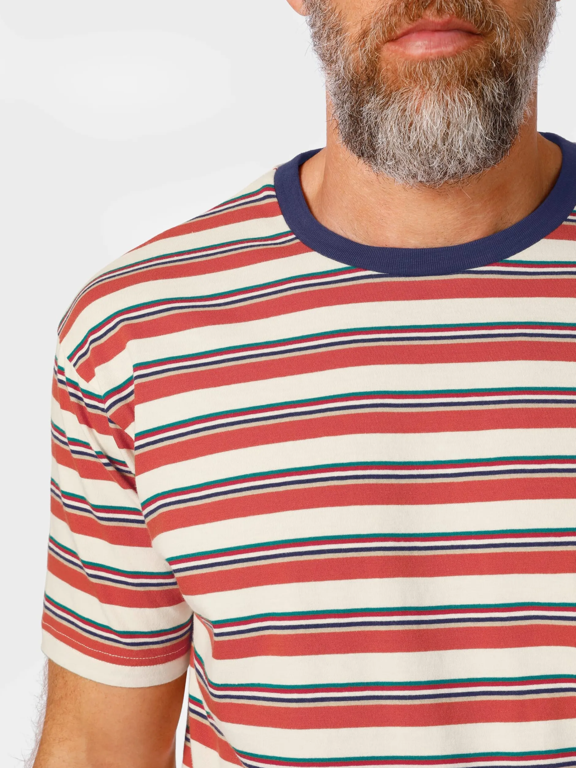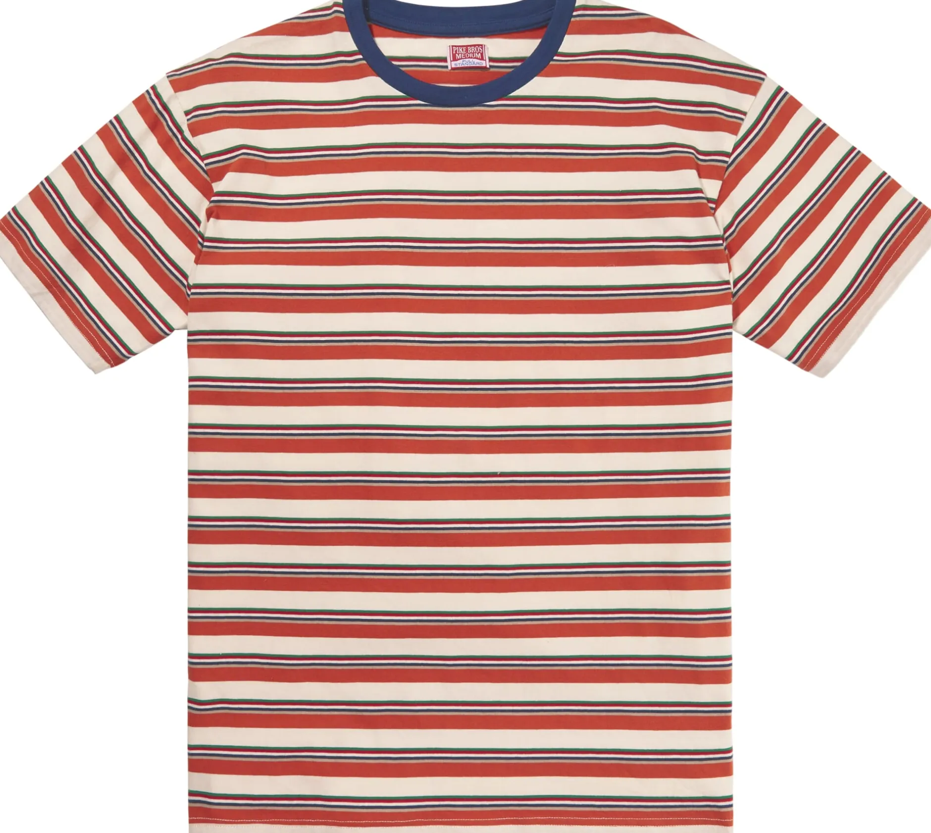 Nachdem das T-Shirt – einst ein Unterhemd – durch Leinwandgrößen wie Marlon Brando und James Dean zur populären Oberbekleidung geworden war, kamen rasch auch farbige und bunt gemusterte Ausführungen auf den Markt. So wie dieses gerade geschnittene (Regular Fit) T-Shirt im Stil der späten 1960er Jahre, dessen Streifen das zu jener Zeit ungemein populäre kräftige Orange zeigen. Ein optisches Detail ist der farbig kontrastierend ausgeführte Rundhalsausschnitt. Pike Brothers fertigt das T-Shirt aus reiner, hautsympathischer Baumwolle.