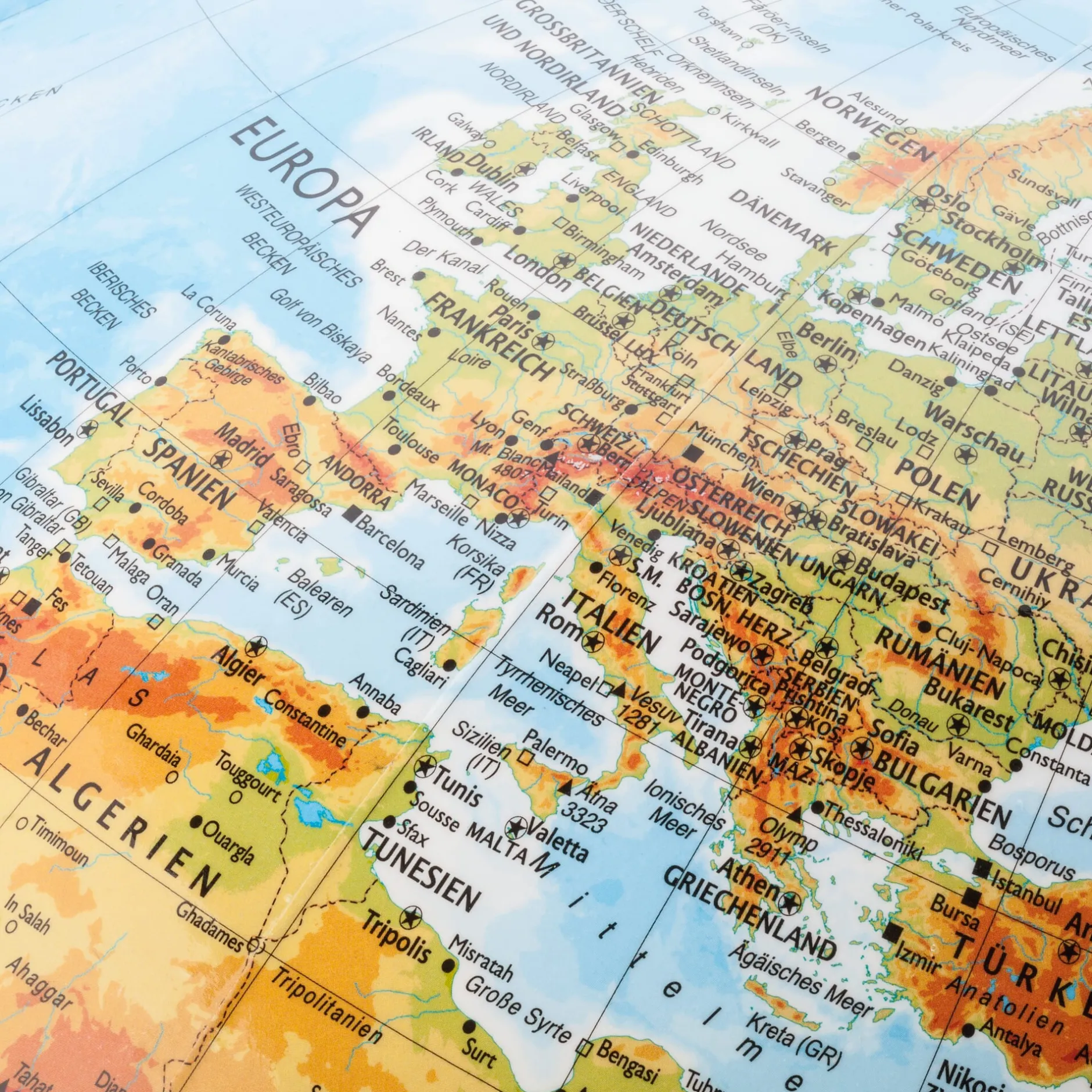 Dieser Räthglobus ist ein Doppelbildglobus: Er zeigt unbeleuchtet ein physisches und beleuchtet ein politisches Kartenbild. Die in zwölf Segmenten handgeschnittenen Drucke werden von Hand kaschiert.