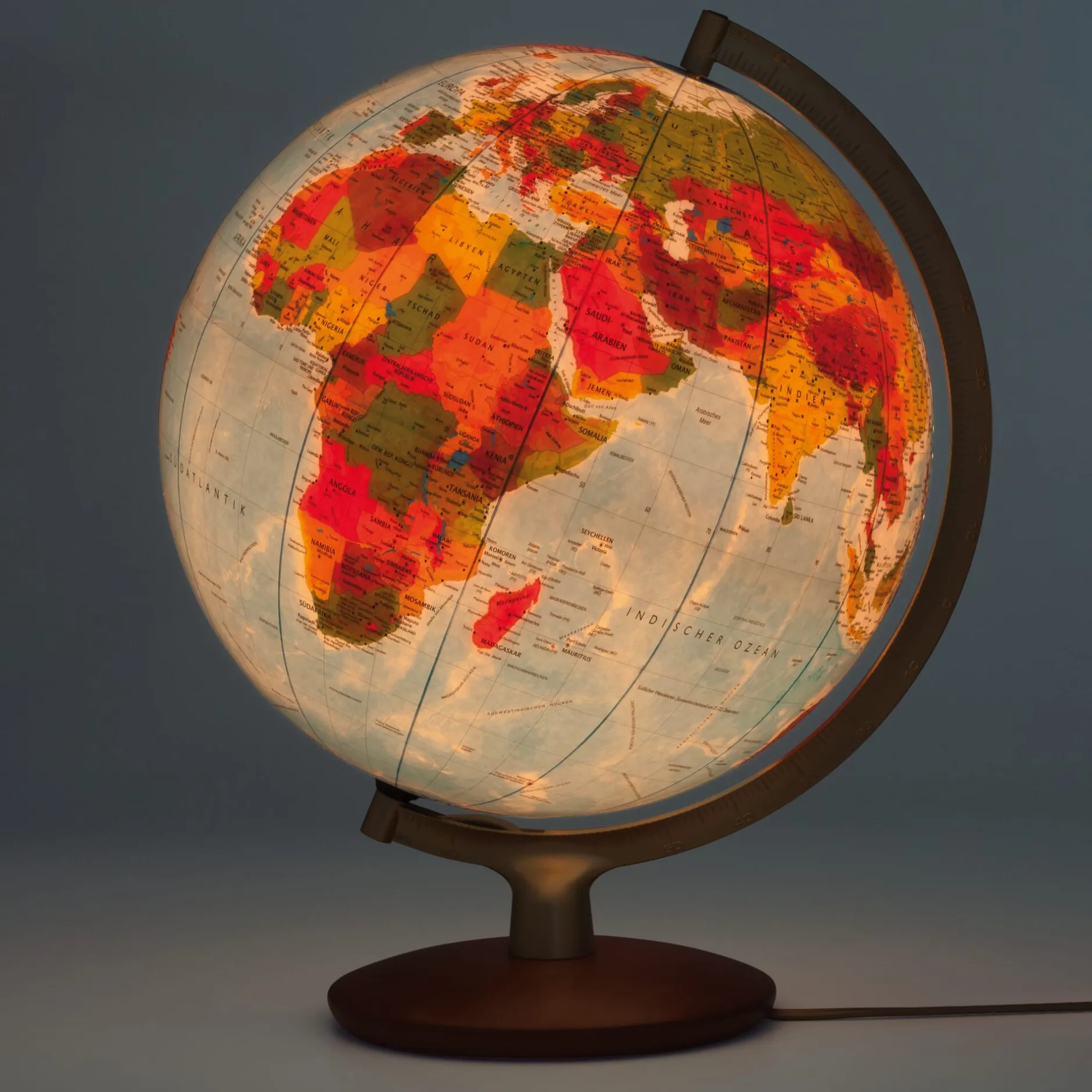 Heute, da Globen praktisch nur noch aus Kunststoff tiefgezogen werden (was sie seit Jahrzehnten immer billiger, aber auch „entsprechend“ macht), gibt es kaum mehr eine Glashütte, die in der Lage ist, die großen Kugeln aus Hartglas zu blasen. Unsere Glasgloben aus dem Räth Globenverlag zu Leipzig repräsentieren die Erfahrung von Generationen; auch weil die Kunst, so etwas zu machen, bald ausgestorben sein wird, sind es Dinge, die unverhohlenen Besitzerstolz rechtfertigen. Ein Glasglobus liefert ein unvergleichlich plastisches Kartenbild – und beleuchtet ist er von ganz eigener, stimmungsvoller Wirkung.