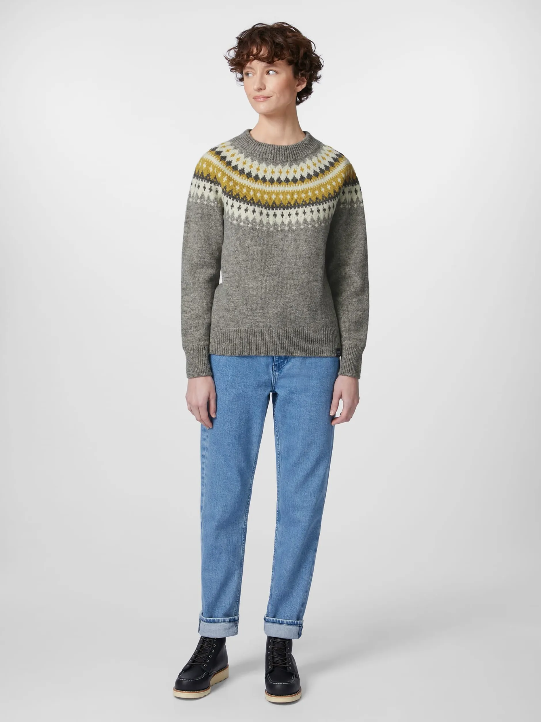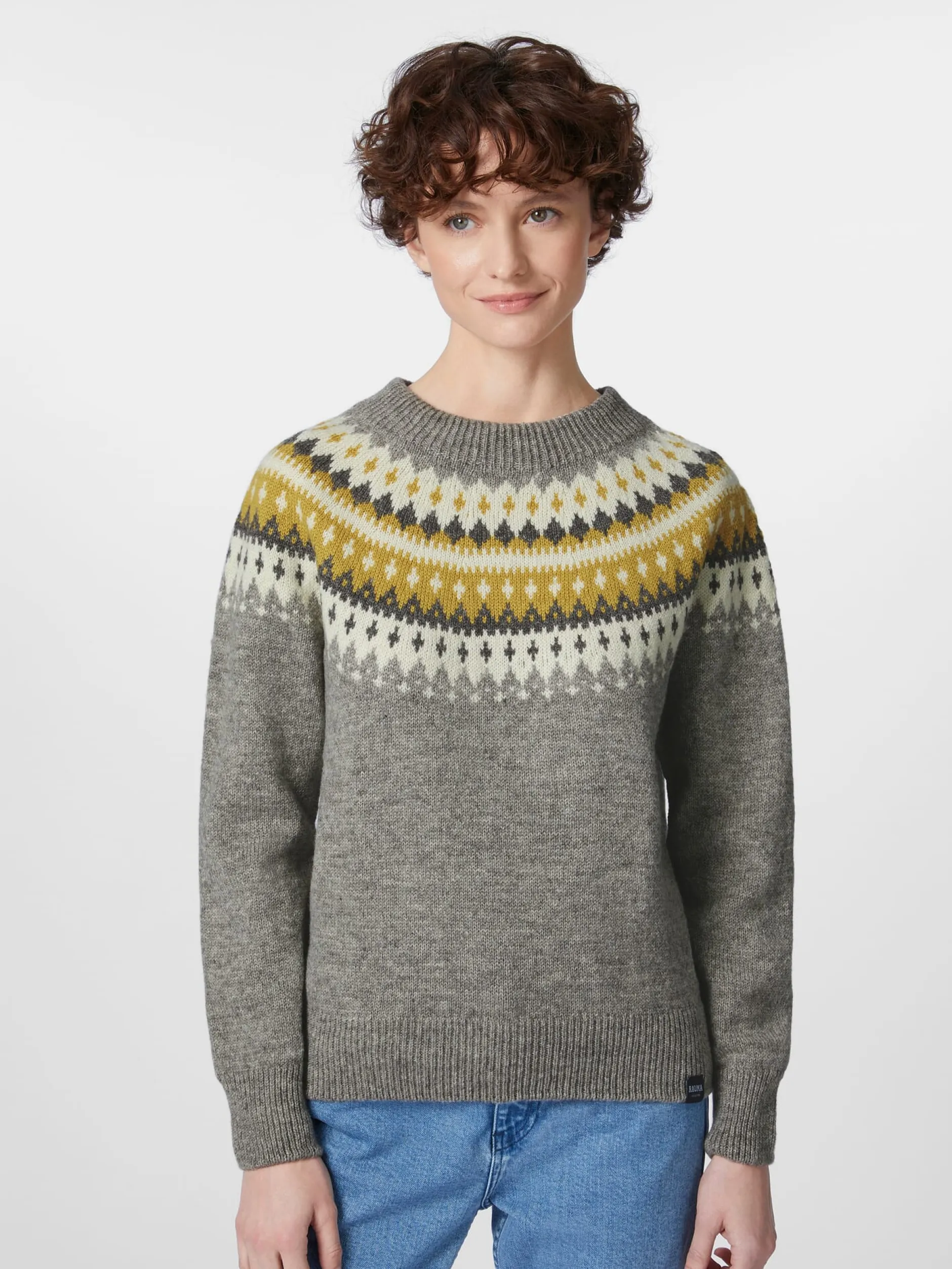 Nicht allein das klassische norwegische Varde-Muster, das über die rundgestrickte Schulterpasse läuft, macht die Besonderheit dieses Pullovers aus, sondern auch das Material. Rauma strickt ihn aus reiner norwegischer Wolle, die dank ihrer Strapazierbarkeit, Unempfindlichkeit und Elastizität eine gute Balance zwischen Funktionalität und Komfort bietet. Zugleich verleiht ihm die Norwegerwolle wunderbar wärmende und temperaturregulierende Eigenschaften, denn die Wollfasern sind stark gekräuselt und können so viel Luft einschließen, was eine effektive Isolierung bewirkt. Rippenstrickbündchen bilden den Abschluss an Hals, Ärmeln und Rumpf.
