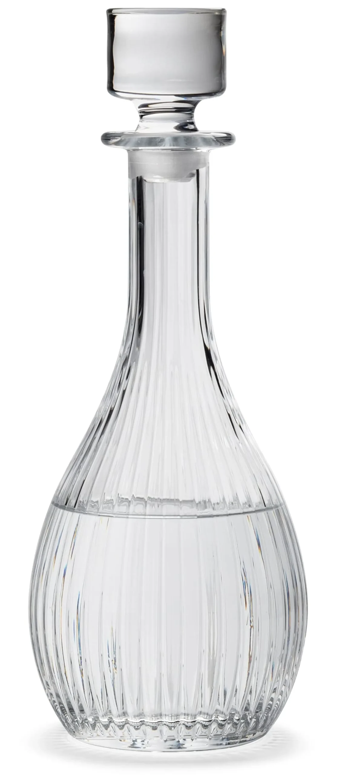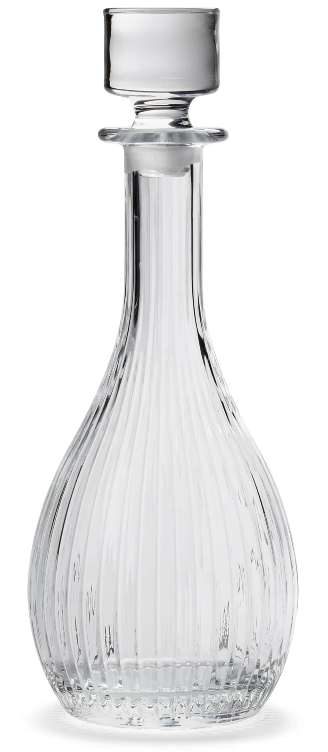 Im Pressglasverfahren aus Kristallglas hergestellt. Mit eingeschliffenem Glasstopfen. Volumen 0,9 l. Höhe 31,5 cm (ohne Stopfen 26 cm), Ø 12 cm. Gewicht 1,2 kg.