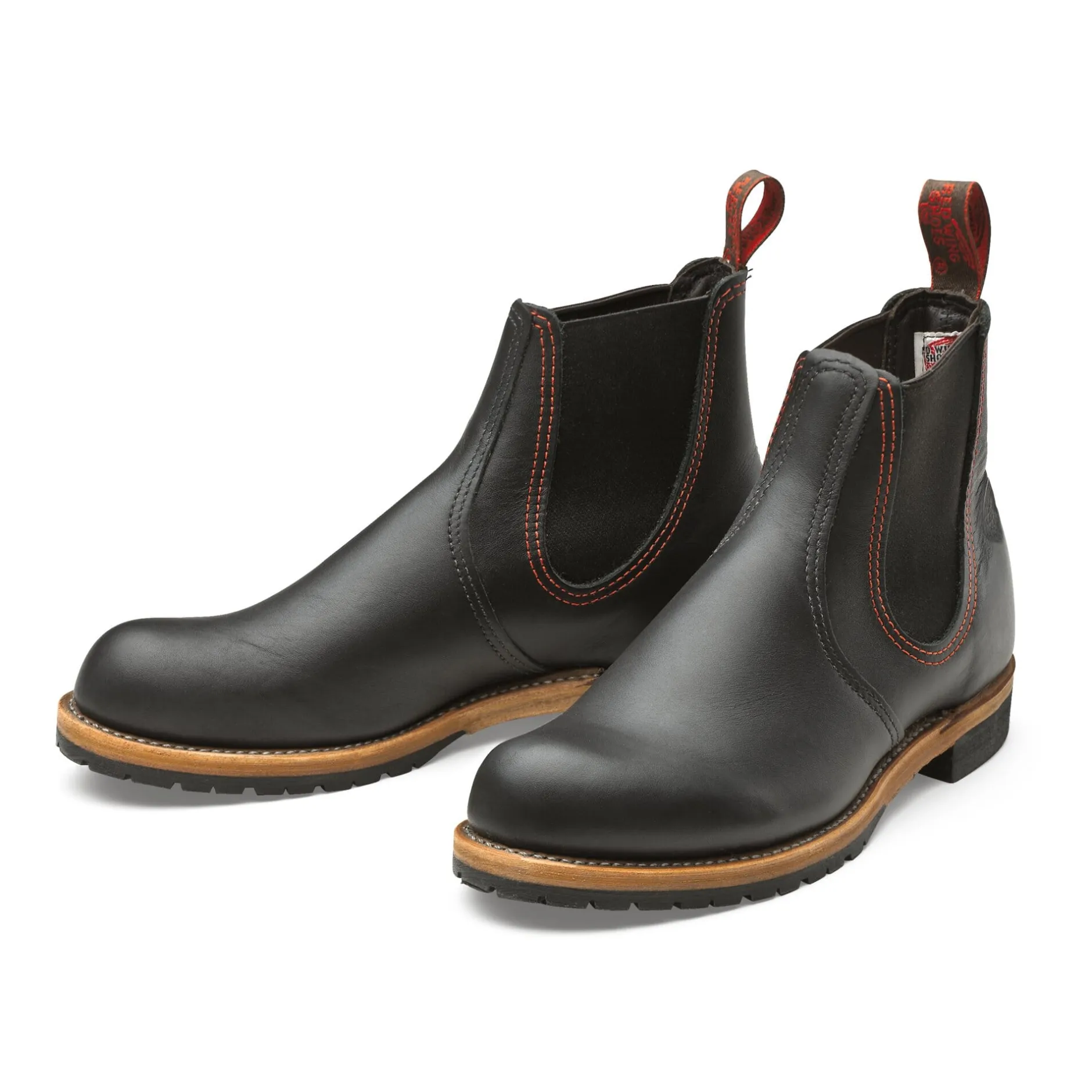 Obermaterial Rindleder, chrom- und mineralölgegerbt. Schaft ungefüttert, Vorderschuh mit Baumwolle gefüttert. Brandsohle aus Rindleder, Profilsohle und Absatz aus Gummi. Seitliche Gummieinsätze mit rotem Kontraststepp. Anziehschlaufen. Hergestellt in den USA.
