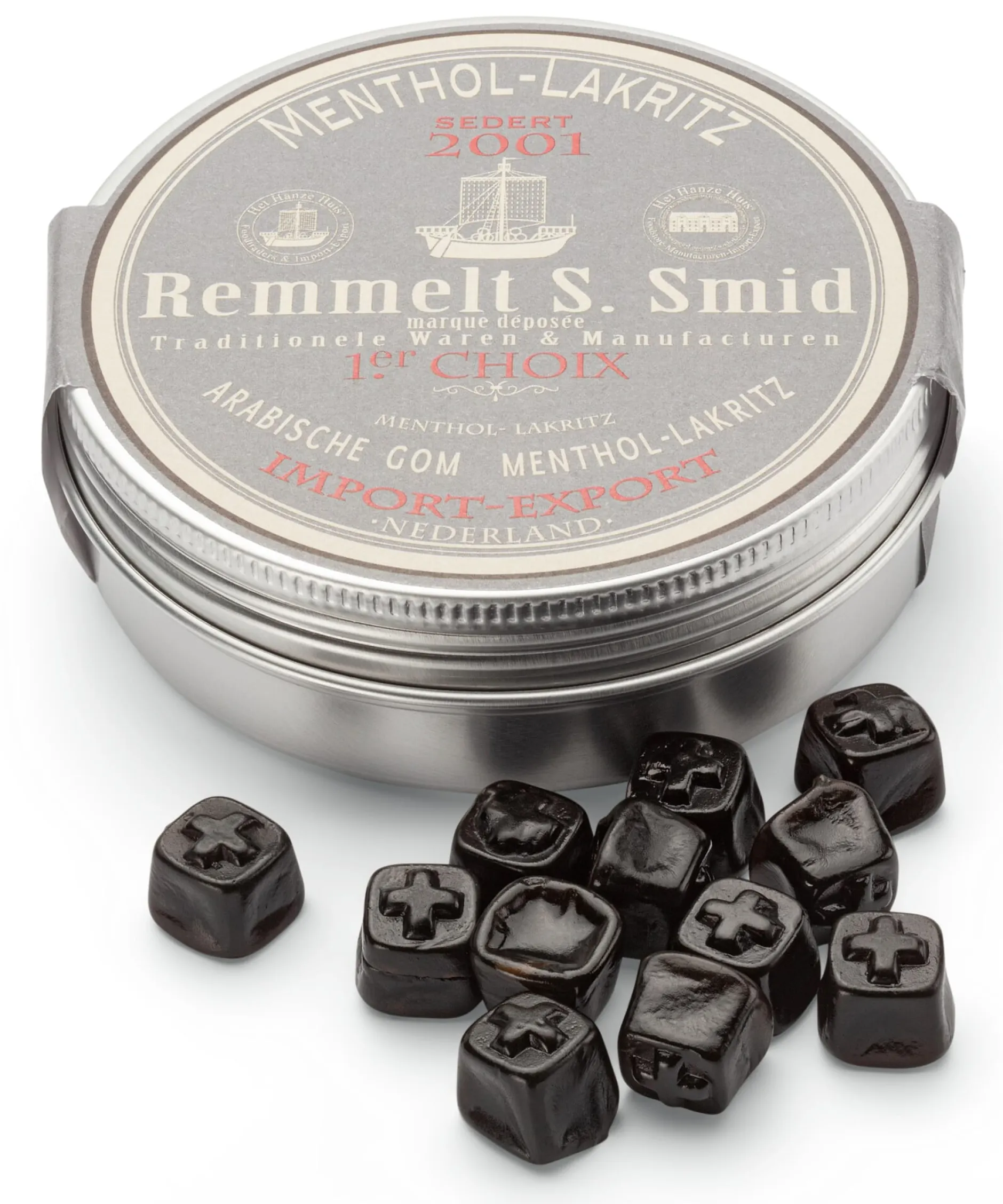 Kleine würfelförmige Menthol-Lakritze belgischen Stils bietet Remmelt S. Smid hier. Ihren würzigen Wohlgeschmack verdanken sie natürlichem, ätherischem Pfefferminzöl. Als Bindemittel dient bestes Gummiarabikum. Ihren Glanz bekommen die Lakritze durch eine Behandlung mit Wasserdampf. Weil dabei weder Bienenwachs noch tierische Ole zum Einsatz kommen, können sie sich mit Fug und Recht vegan nennen. Die Suikerbakkerij Joris, eine am Stadtrand von Brüssel ansässige Konfiserie, stellt die Menthol-Lakritze seit 1938 her, mit handwerklicher Sorgfalt und der Erfahrung von vier Generationen. Nach einiger Zeit im Mund werden sie weicher und wärmer und die köstlichen Aromen von Lakritz und Menthol entfalten sich – was sehr erfrischend für die Atemwege ist.