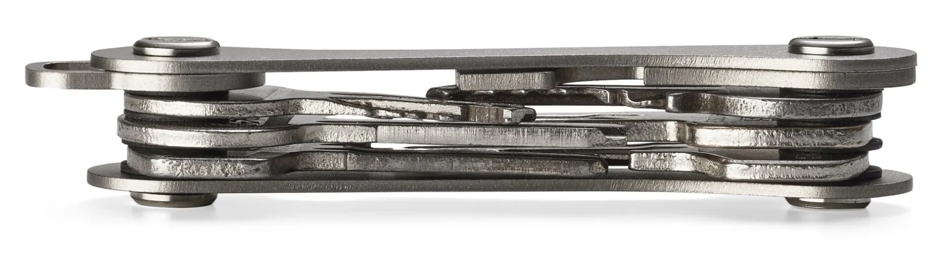 Zwischen zwei Edelstahlbacken fasst der Schlüsselorganisator bis zu 16 Schlüssel zu einem übersichtlichen Ganzen zusammen. Die Schlüssel werden einzeln eingelegt und so fixiert, dass sie sich später wie das Werkzeug eines Taschenmessers aus- und wieder einklappen lassen. Und so wird aus dem Bündel Schlüssel eine Art „Barren“, aus dem mit einem Griff der richtige Schlüssel gewählt werden kann und der zur Ordnung in der Hosentasche beiträgt (und die Taschenbeutel noch vor Beschädigung schützt).