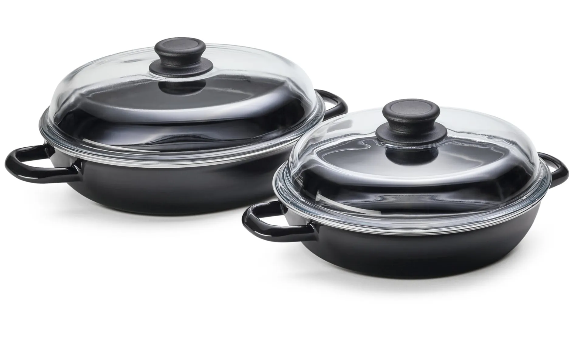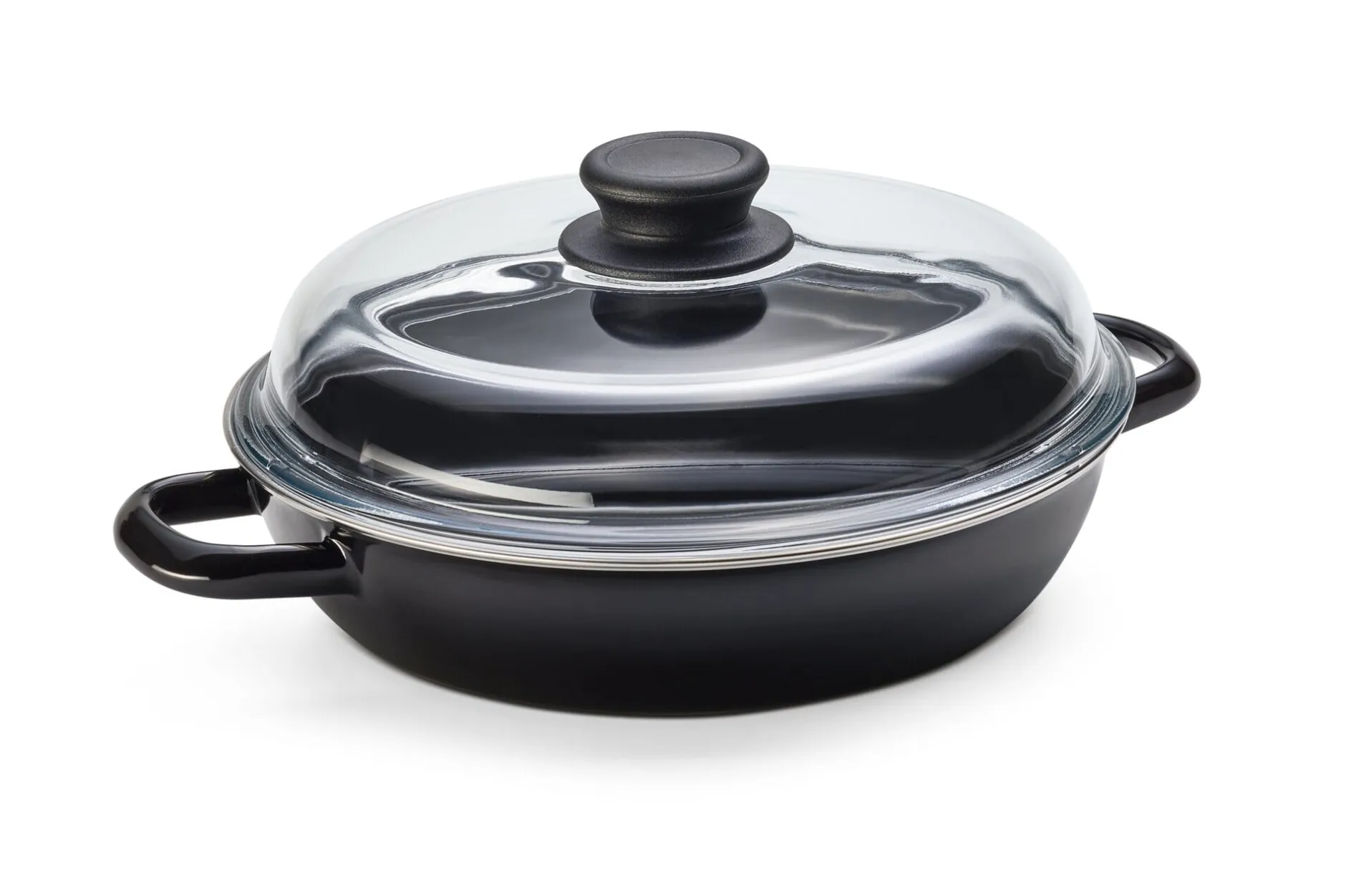 Diese Emaille-Schmorpfannen von Riess in Österreich werden mit Glasdeckel geliefert. Garvorgang und -fortschritt bleiben darunter stets unter Kontrolle. Ob die Hitzezufuhr reguliert oder möglicherweise etwas Flüssigkeit nachgefüllt werden muss, lässt sich auf einen Blick erkennen. Mit dem Knauf aus Duroplast sind die Deckel sogar ofenfest, was eine Verwendung der Pfannen als Bräter ermöglicht.