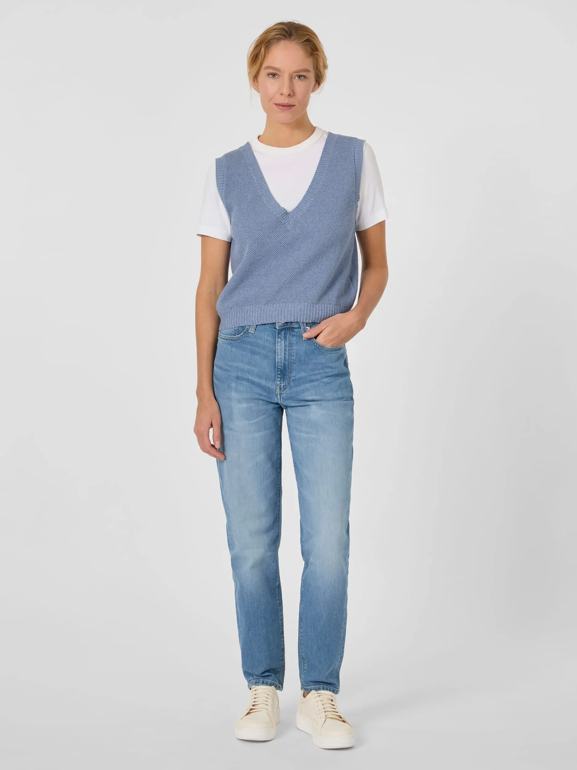Für diesen Strickpullunder verwendet Rifò hautsympathische Baumwolle, die zu gleichen Teilen aus kontrolliert biologischem Anbau und Recycling-Beständen stammt. Das markante Perlfangmuster verleiht ihm eine markante Optik und einen leicht körnigen Griff. Gearbeitet ist der Pullunder in bequemer Passform mit tiefem V-Ausschnitt. Rippenstrickbündchen bilden den Abschluss an Hals, Armausschnitten und Rumpf.