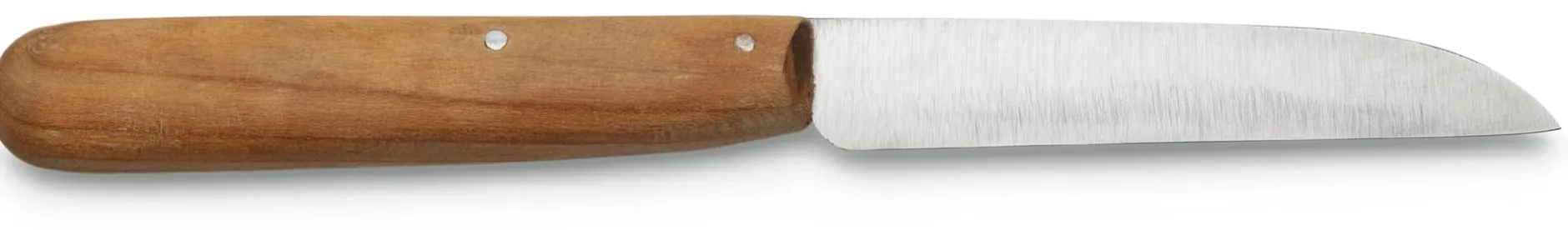 Dass mit dem Ende des Krieges längst nicht alle Gemüsemesser herausgegeben worden waren, stellte sich jedoch erst jüngst heraus, als in der Manufaktur Umbauarbeiten anstanden und die Mitarbeiter*innen sich ans Aufräumen machten. Denn über Umwege waren einige Schatzkisten hinter dem großen Ofen im ehemaligen Holz-Trockenraum gelandet – gut versteckt, gerieten sie dort in Vergessenheit. So kommt es, dass wir Ihnen hier ein Herder-Gemüsemesser anbieten können, das aus Originalbeständen aus der Zeit vor 1940 stammt. Da unbenutzt, ist die Klinge dieses „Hümmelkens“ aus rostfreiem Messerstahl noch so scharf wie am ersten Tag. Wie zum Beweis für seine Geschichte finden sich gelegentliche Spuren der Alterung nur an den Eisennieten, mit denen die Heftschalen aus fein beschliffenem Kirschbaumholz fixiert sind. Und ob Sie darin einen Gebrauchsgegenstand sehen oder ein Sammlerstück – voll funktionsfähig ist dieses Messer in jedem Fall. Eine weitere Besonderheit: Es zählt zu den ersten Messern, die in der Windmühlenmesser-Manufactur mit rostfreier Klinge hergestellt wurden.