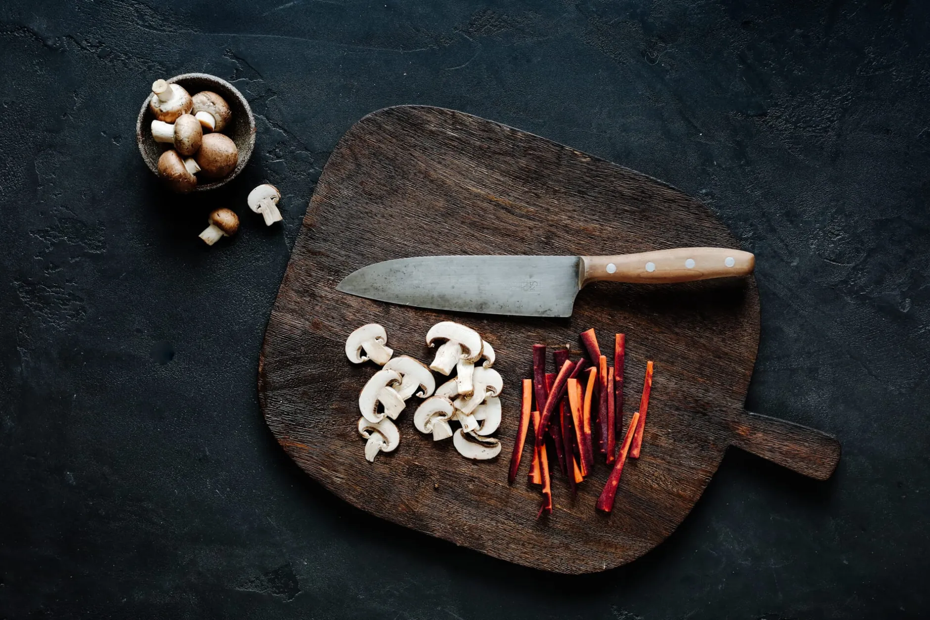 Das traditionelle Material für Messerklingen ist der Kohlenstoffstahl. Dieser ist nicht rostfrei, lässt sich jedoch bei feinkörnigem Gefüge besonders hoch härten und extrem scharf zurichten. Dabei gilt: Je höher der Kohlenstoffanteil, desto höher kann gehärtet werden. Ihre hohe Schneidfähigkeit verdanken diese Messer neben der Zurichtung also dem Material, ihre hohe Schneidhaltigkeit einem materialbedingten Selbstschärfeffekt. Bei jedem Schnitt durch Obst oder Gemüse findet ein minimaler Materialabtrag statt und die Klinge nutzt sich gleichmäßig ab. Der Messermacher spricht hier von Mikrokorrosion. Tatsächlich bedeutet dies, dass die Klinge mit den Jahren stetig schmaler wird – ihren scharfen Schliffwinkel aber immer behält. Klingen aus Kohlenstoffstahl setzen mit der Zeit eine dunkle Patina an, die ihre Qualität jedoch keinesfalls negativ beeinflusst, sondern ihnen im Gegenteil einen besseren Schutz gegen Korrosion verleiht.