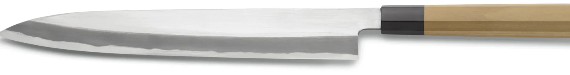 Typisch Wa-bocho: klassisches japanisches Kochmesser. Mit einer Schneidlage aus Shiro-gami II, dem sogenannten weißen Papierstahl: unlegierter Kohlenstoffstahl, der nicht rostfrei ist. Außenseiten der Klinge aus VG-10-Stahl: rostfreier Edelstahl. Härte ca. 62 Rockwell (HRC), beidseitig geschliffen (Ryo-ba). Holzgriff aus Japanischer Graumagnolie (Ho-Hakkaku), Zwinge aus Wasserbüffelhorn.