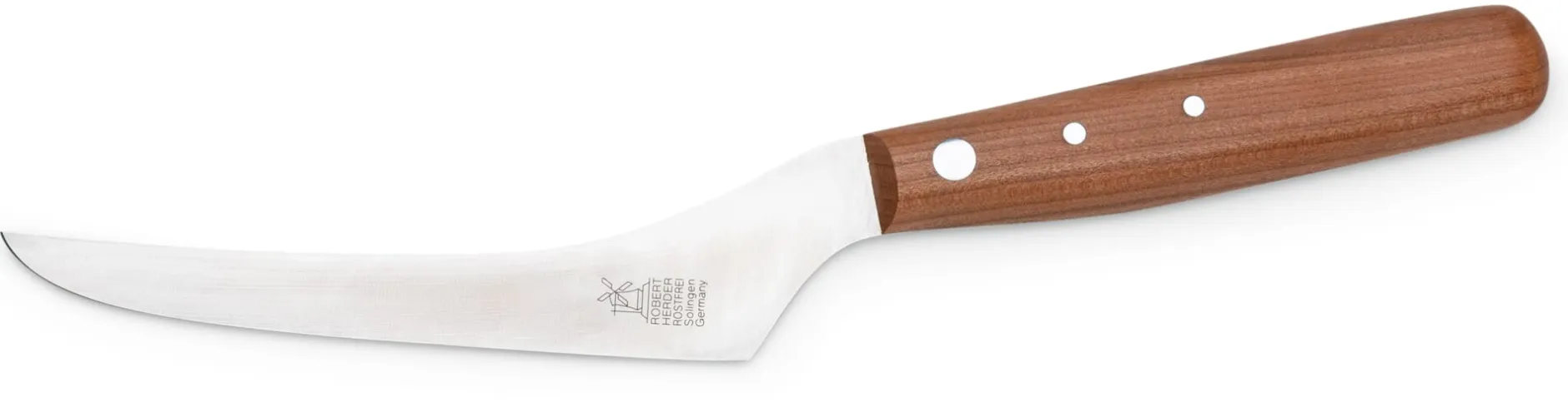 Nicht ohne Stolz wird dieses Käsemesser bei Herder „Meisterstück“ genannt. Es bringt eine schmale, scharf geschliffene und von Hand blaugepließtete Klinge mit, die sowohl über die nötige Flexibilität wie Stabilität verfügt, die es braucht, soll unterschiedlichen Käsesorten mit dem richtigen Schnitt zu „Laibe“ gerückt werden. Die leicht gebauchte Schneide geht mühelos durch weiche wie festere Käse, und selbst härtere Käserinden lassen sich beim „Abrollen“ des Messers einfach durchwiegen. Die Klinge steht zudem zum Griff in einem Winkel von rund 35°, so ergibt sich unter dem Griff und über dem Schneidbrett viel Raum: Das ermöglicht eine natürliche Handhaltung, verbessert die Kraftübertragung und erleichtert insbesondere das Käseschneiden bei Tisch, da die Hand, die das Messer führt, nicht auf dem Schneidbrett anstößt.