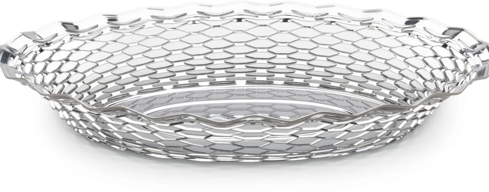 Ein französisches Essen ohne den vertrauten Brotkorb mit knusprigem, frisch geschnittenem Baguette? Kaum vorstellbar. In der Auvergne darf er gern aus durablem Metall sein, schließlich pflegen die Menschen in der Region im Herzen Frankreichs gern ihre lebendige Tradition in der Metallverarbeitung. Denn damit sich eine makellos ausgestanzte Edelstahlronde – die zunächst so glatt daliegt wie der Lac d’Aydat an einem windstillen Morgen – in eine dreidimensionale Form verwandelt, braucht es die rechte Schmiedetechnik und Erfahrung. Dafür steht Roger Orfèvre, (ein „Orfèvre“ ist ein Feinschmied). Das Familienunternehmen, das seit 1924 in Escoutoux bei Thiers ansässig ist, hat sich auf die Herstellung von Besteck und Utensilien für den gedeckten Tisch spezialisiert. Seit Großvater Roger Sozedde das Unternehmen gründete, hat sich die Produktion stark gewandelt; geblieben ist das Prinzip, moderne Fertigungstechniken mit handwerklicher Schlussbearbeitung zu kombinieren. So hält es auch die heutige Generation: die Geschwister Élise, Rémi und Thibault Sozedde. In ihrer Manufaktur wird aus Edelstahlblech die Form gestanzt und geprägt; anschließend tiefgezogen, entsteht ein nahtloser, robuster Korb, der den idealen (gut belüfteten) Platz bietet für Baguette und Brioche und die ganze Vielfalt an Brot aus den Küchen der Welt.
