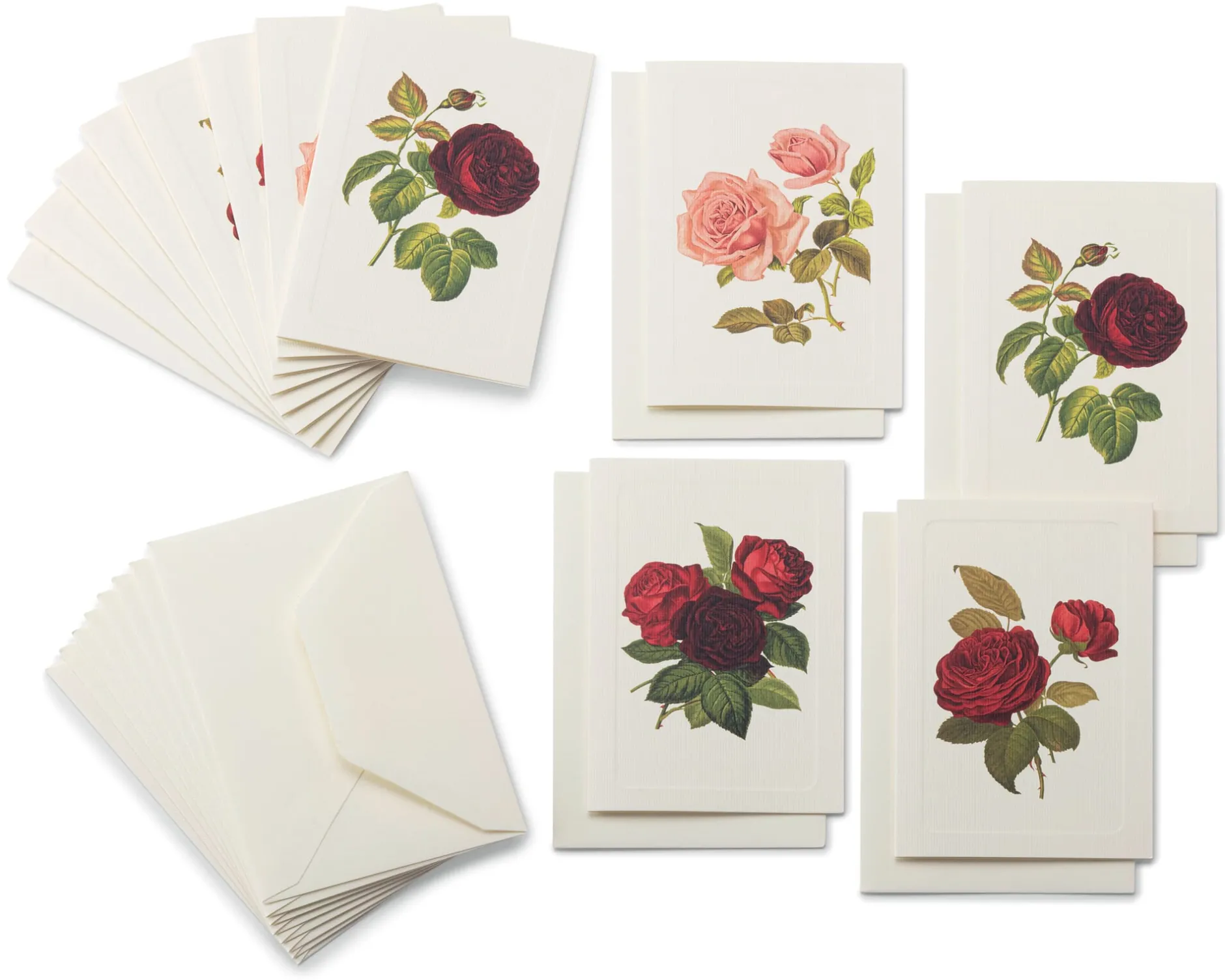 4 Rosenmotive auf je 3 Klappkarten (Grammatur 240 g/qm) im Format 8,5 × 13 cm. Mit 12 passenden Umschlägen (120 g/qm) im Format 9 × 13,5 cm. In einer Kunststoffbox. Hergestellt in Italien.