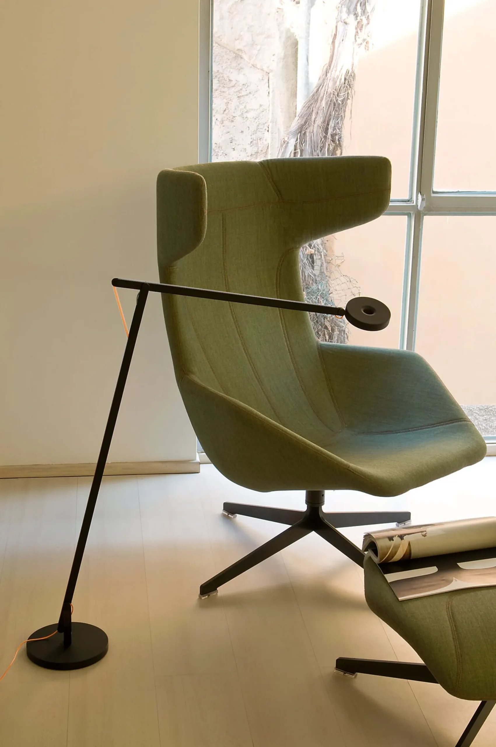 Feingliedrige Struktur aus Aluminium, mit höherem Gelenkarm unten, weit orientierbarem Ausleger und schwenkbarem Leuchtenkopf mit zentraler Öffnung und leistungsstarker LED – STRING ist eine ideale Leuchte am Lese- und Arbeitsplatz und verfügt über die sogenannte Dim-to-warm-Funktion. Bedeutet, dass der integrierte (touch) Dimmer (im Kopf integriert) das erzeugte Licht von kühl und hell nach wärmer und dunkler herunterregelt. Die Bewegung der beiden Aluminiumarme wird durch ein elastisches und farbig ummanteltes Kabel gesteuert, was eine feine und detaillierte Beweglichkeit der Gelenke ermöglicht.