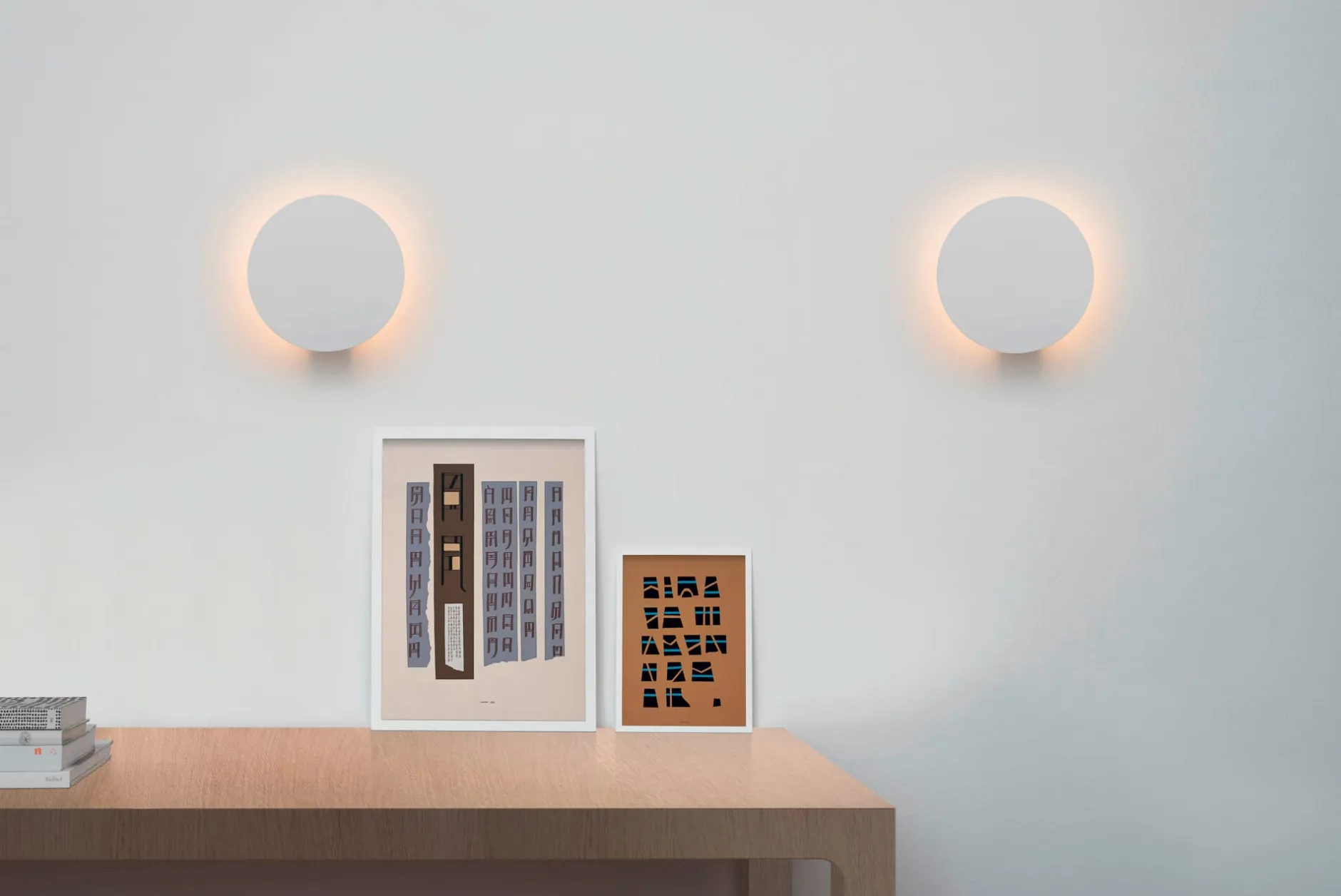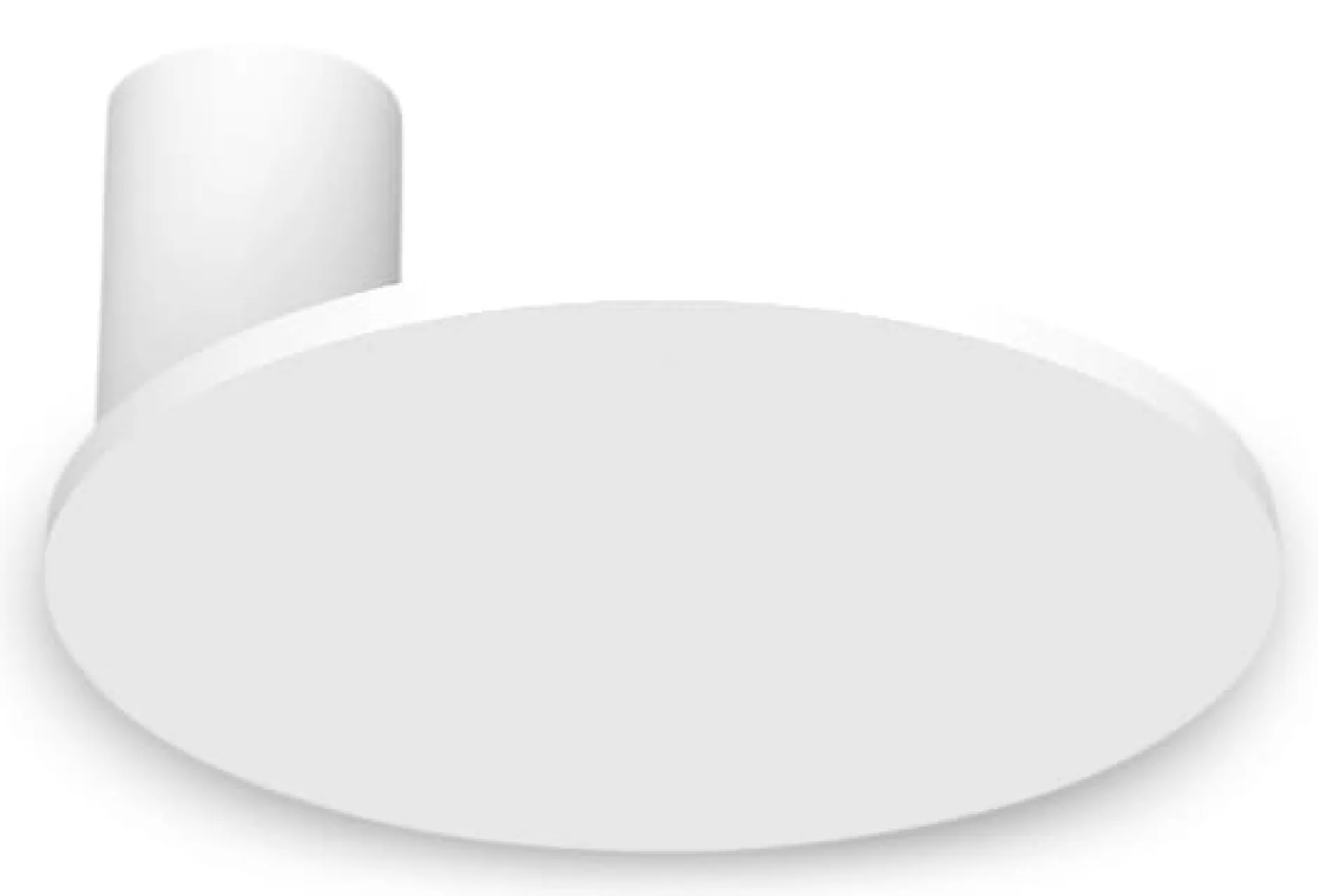 Eine runde Aluminiumscheibe scheint vor Wand oder Decke zu schweben – dazwischen erstrahlt weiches Licht. Die besondere Konstruktionsidee macht diesen Eindruck möglich: Denn die flache Scheibe, die das Leuchtmittel integriert, ist an einem zylindrischen Sockel befestigt, der sie von der Oberfläche absetzt. Die Rückseite der Scheibe ist verspiegelt, um zusätzlich Licht zu reflektieren. So strahlt warmweißes Licht gegen die Wand. Dort wird es gestreut und nochmals reflektiert, wodurch ein sanfter Lichtring um die Aluminiumscheibe herum entsteht.