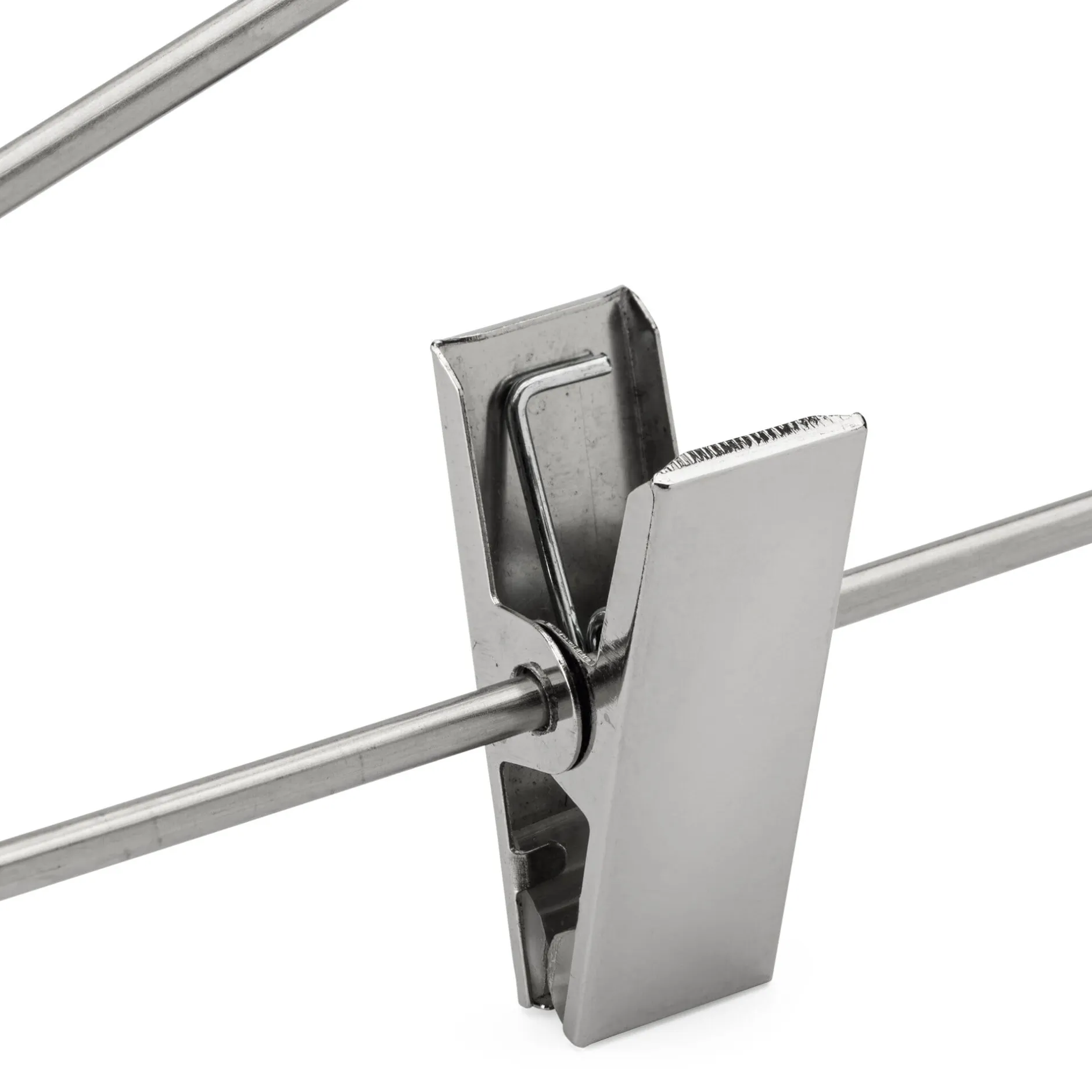 Wir bieten unsere Stahlkleiderbügel in zwei Ausführungen: eine einfache mit Hosensteg und eine mit Klammern für Röcke.
